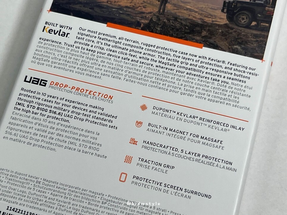 uag 케이스를 쓰는 사람 대부분 아웃도어 활동에서 케이스의 진가를 발휘한다는 것을 경험하였을 것이다. 그래서 기종을 바꿀 때도 계속 uag를 찾게 된다. 왼쪽에 적힌 영어가 궁금한 분들이 있을 텐데 밀스펙에 대한 설명을 간단하게 해본다.