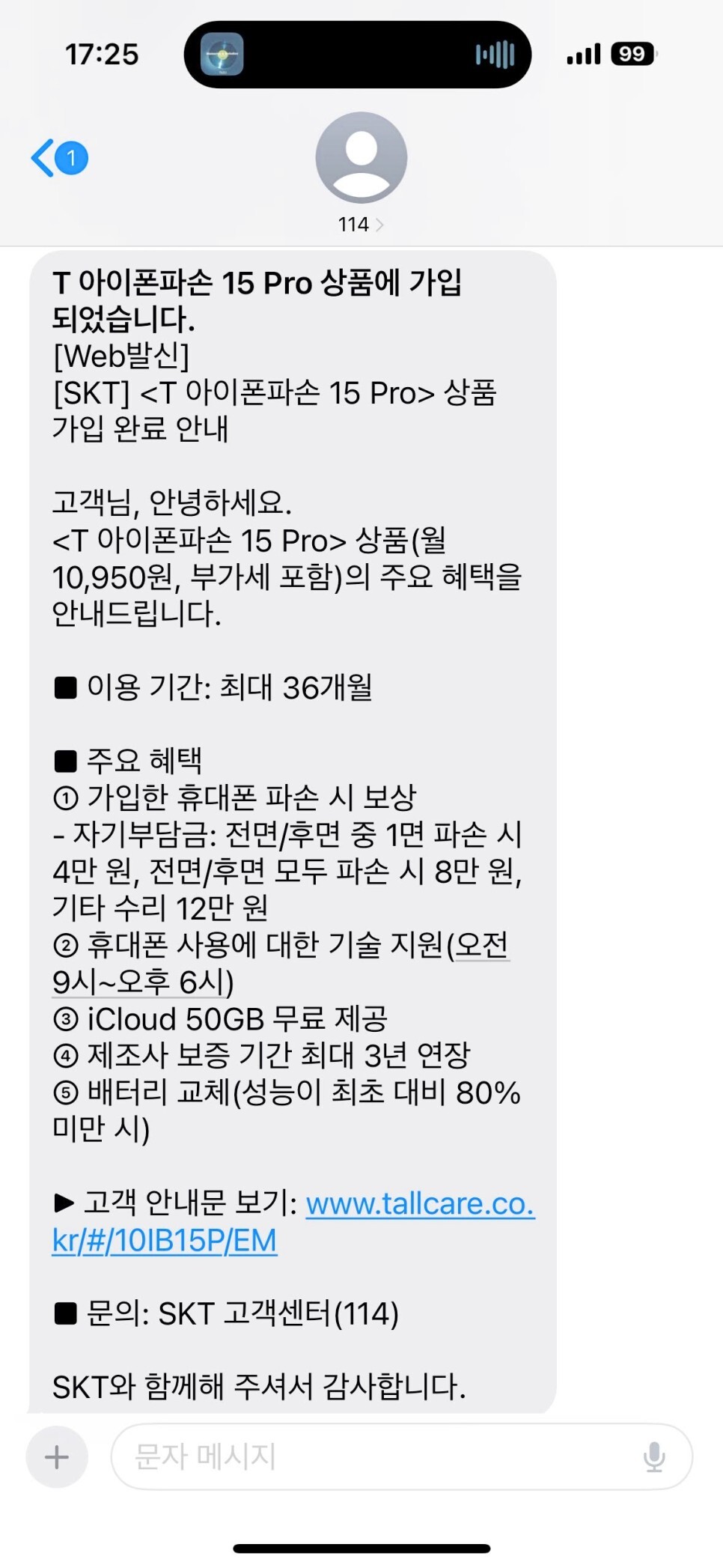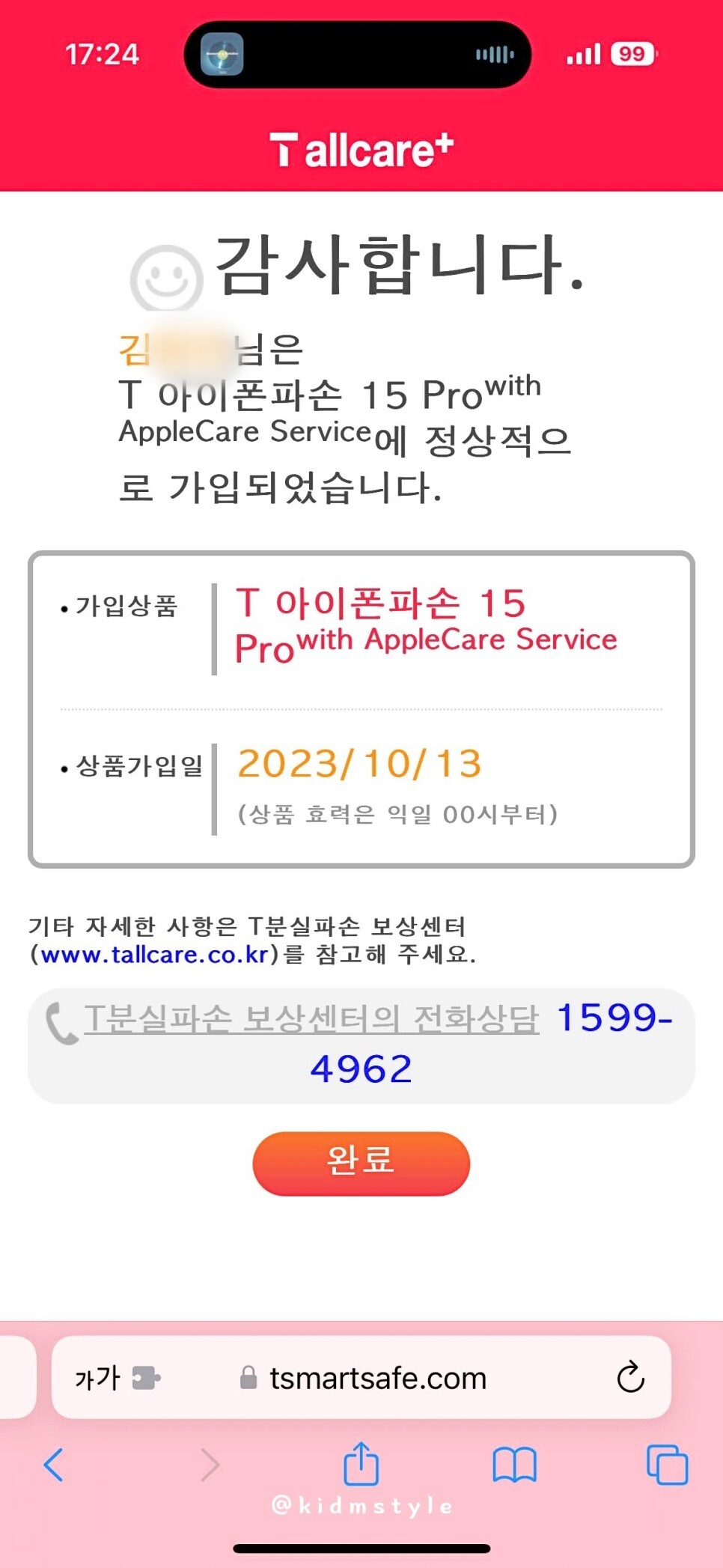 그리고 애플 제품은 애플케어플러스가 필수 아닌 필수인데 애플 상품보다는 skt와 애플의 협업으로 제공되는 상품인 T아이폰파손 아이폰15프로 서비스에 가입했다. 애케플보다 혜택이 더 좋은 상품이다.