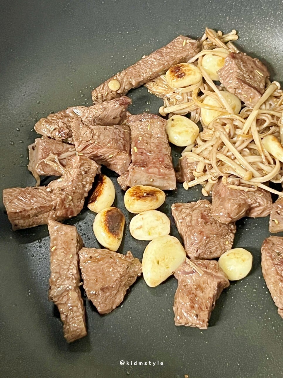 생각을 바꾸고 팽이버섯도 좀 넣고 큐브 모양으로 잘라서 먹기로 한다.