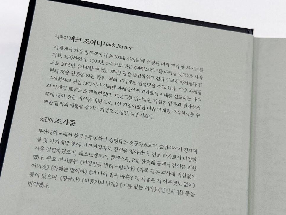 이 책은 마크 조이너라는 사람이 적은 책인데 마케팅과 컨설팅을 하는 분이다. 트렌드를 읽어내는 안목과 지식으로 본인의 회사를 성장, 발전시킨 저력이 있는 저자이다.
