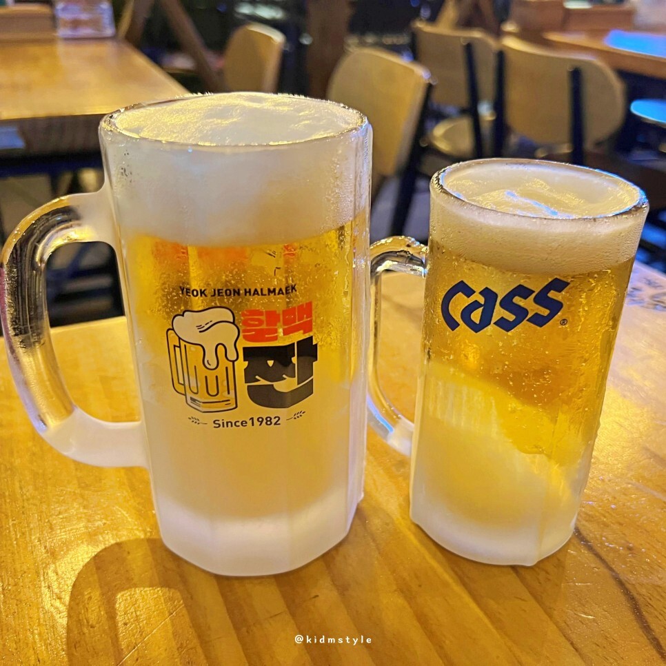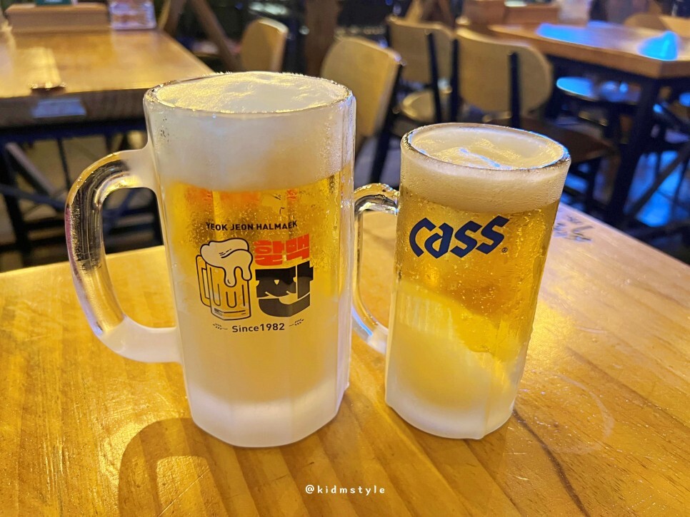 주문한 맥주가 나왔다. 나는 500cc, 친구는 330cc 작은 잔으로 주문. 이때가 9월 중순이라 더웠는데 시원한 생맥주가 너무 반갑더라. 물론 추운 요즘 마셔도 늘 좋은 게 생맥주이다.