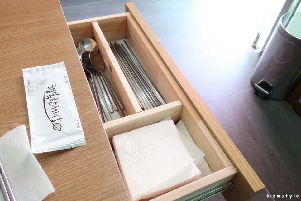 수저와 냅킨은 옆에 서랍을 열면 담아져있다.