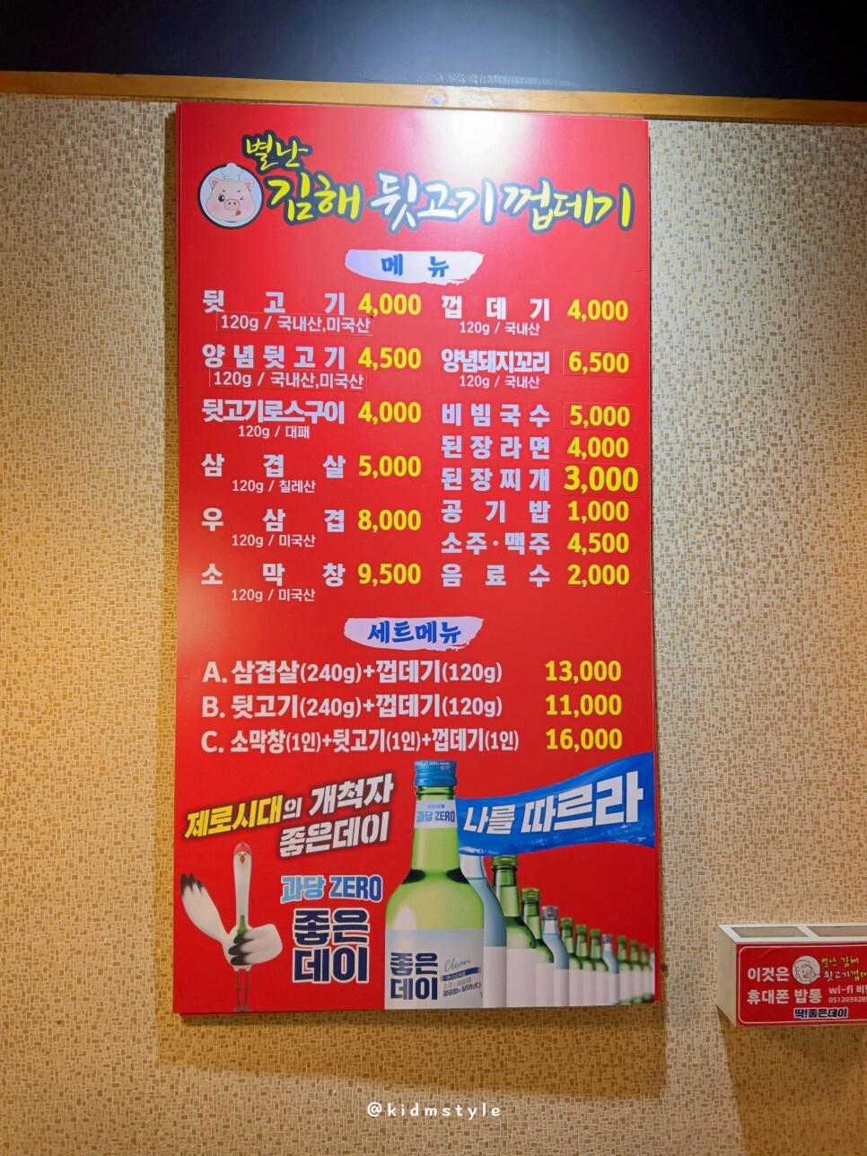 메뉴판이다. 가격이 전반적으로 저렴하다. 뒷고기 120g 1인분에 4,000원이다. 그리고 눈에 딱 들어오는 양념돼지꼬리!