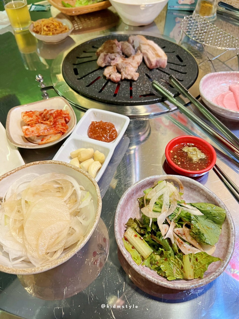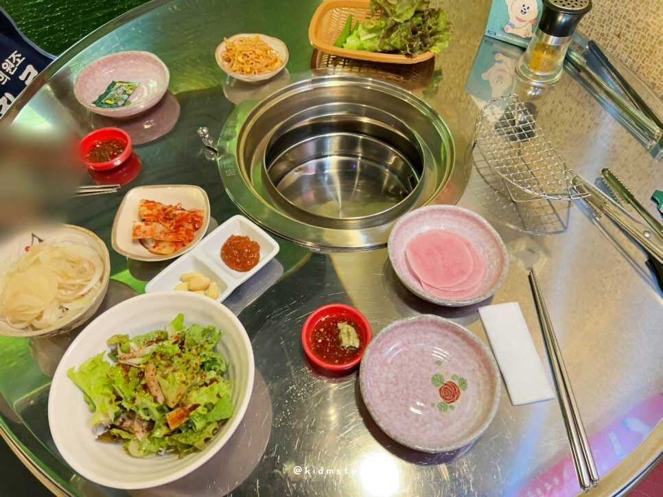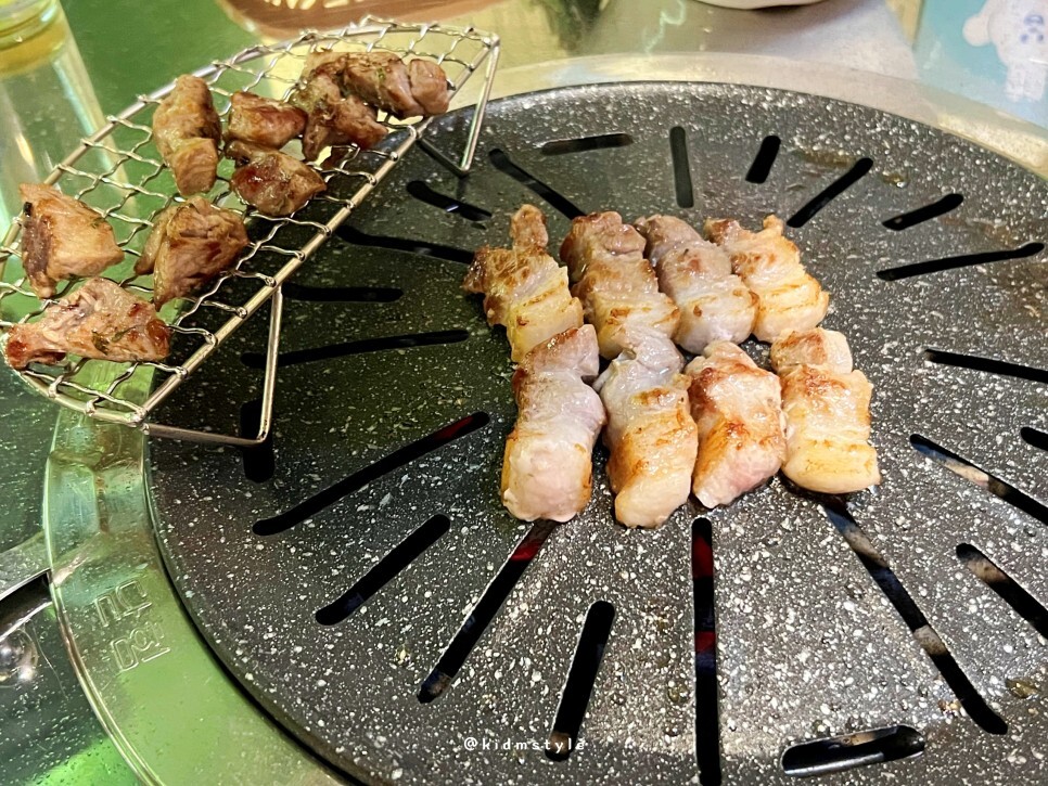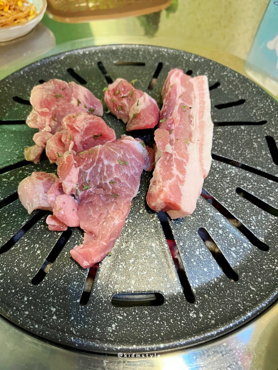 반들반들 코팅이 잘 되어있는 불판 위에 뒷고기와 삼겹살을 올리고 본격적으로 굽기 시작한다. 친절하기도 친절한데 하나하나 깔끔하고 깨끗하게 관리되고 있는 모습이 너무 마음에 든다.