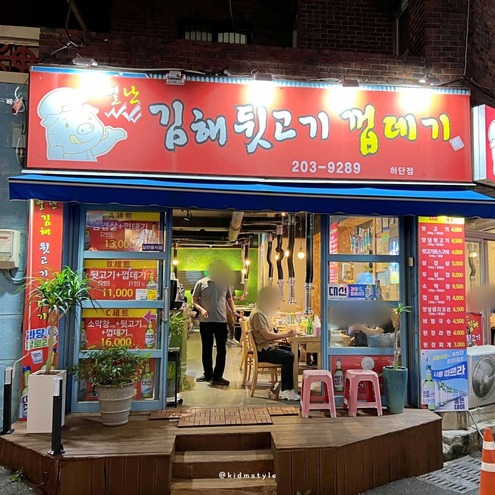 하단오거리에서 에덴공원 쪽을 지나 동아대 맞은편 술집 골목으로 가면 등장하는 곳 별난김해뒷고기껍데기 하단점이다.