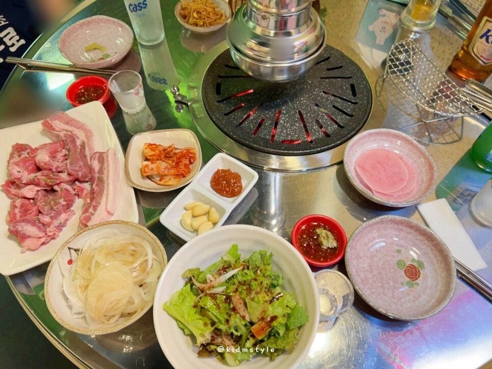 불판에 가려서 잘 안 보이는데 아래 영상에 나오지만 숯이 상당히 좋다. 뒷고기와 삼겹살 고기 때깔도 좋다.