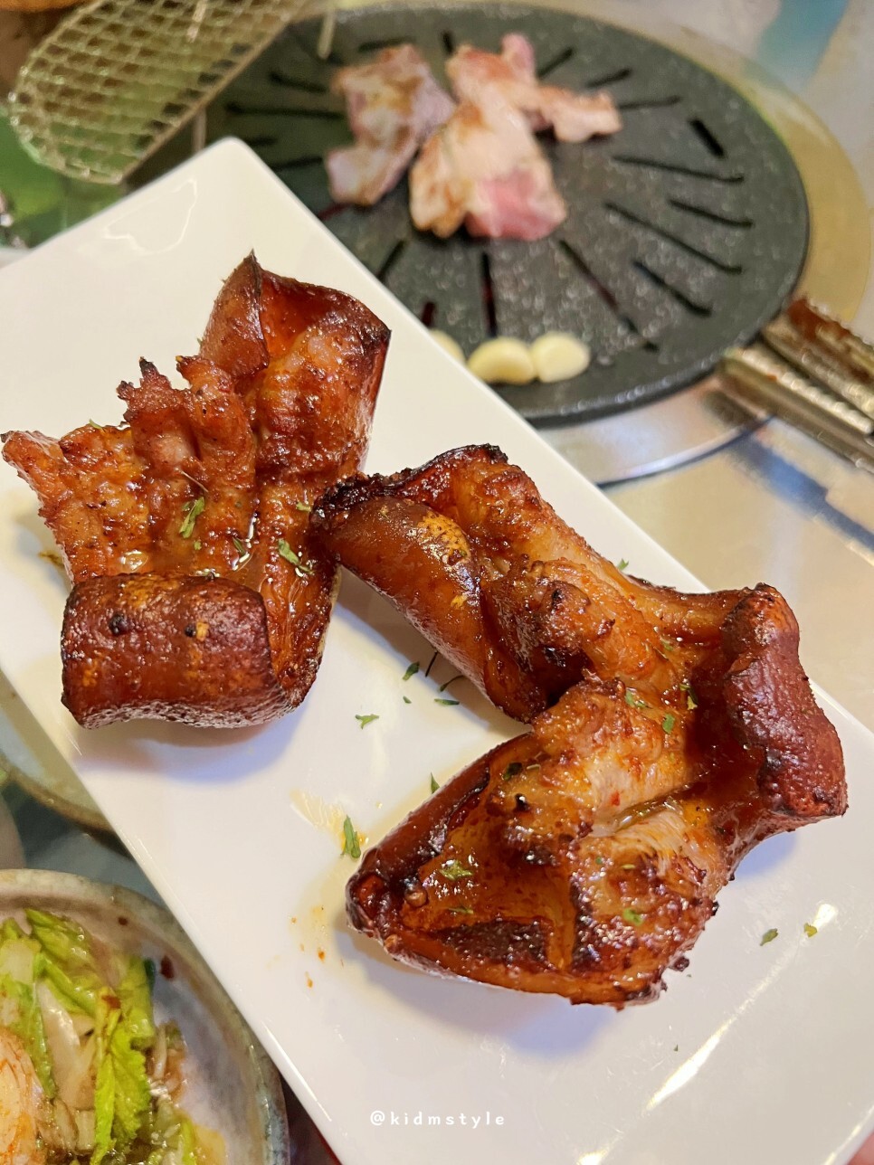 돼지꼬리를 먹기 좋은 크기로 잘라서 조금 더 구워준다. 마늘도 굽고. 쫄깃쫄깃 너무 맛있는 돼지꼬리이다.