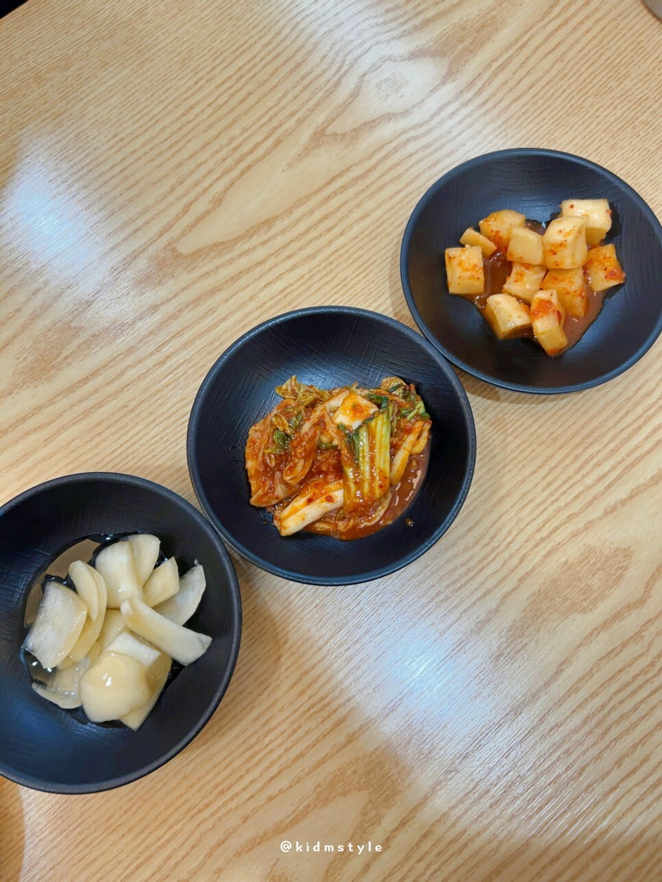 기본 반찬은 양파지, 김치, 깍두기가 나온다. 참고로 김치가 매콤한 편.