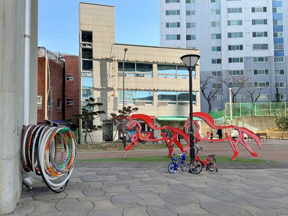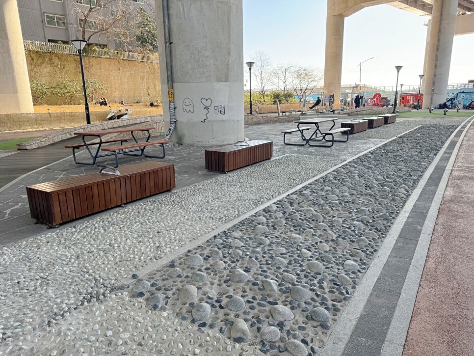 교각에 걸려 있는 많은 훌라후프가 재미있습니다. 공간이 넓어서 여유롭게 훌라후프를 돌릴 수 있기도 해요.