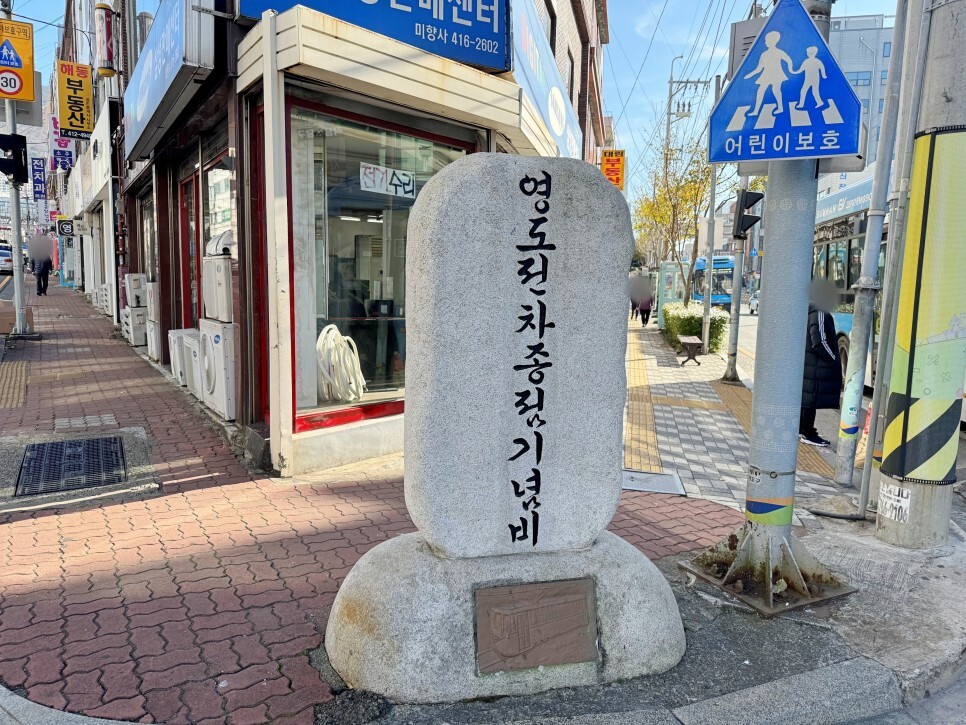 남항동 버스정류장에 하차하여 영도전차종점 기념비를 찍고 식사를 하러 갑니다. 1935년부터 1967년까지 전차가 운행되었던 사실을 기억하기 위해 구민들의 뜻을 모아 건립한 기념비입니다.