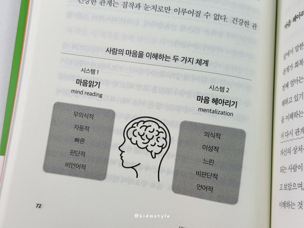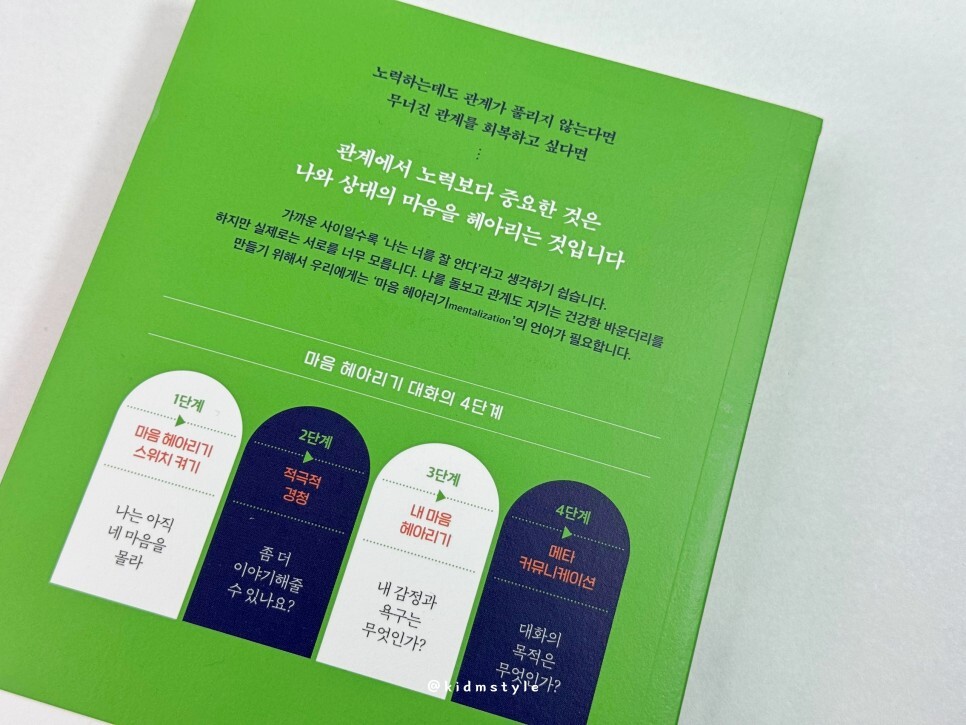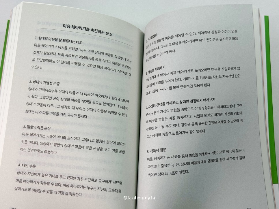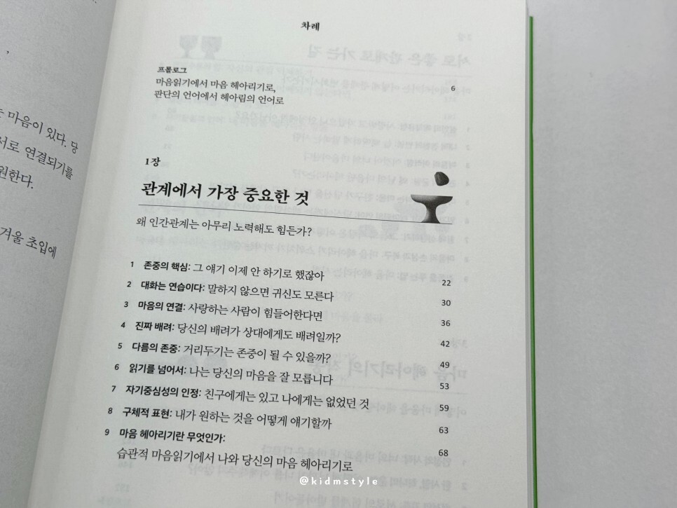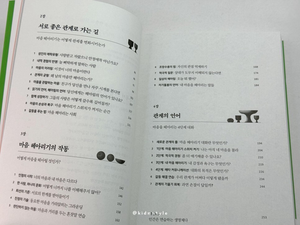 더 자세한 이야기는 책을 읽어보면 나온다. 관계 회복에 관해 다양한 이야기를 제시한다. 자신의 마음 헤아리기는 빠지지 않는다.
