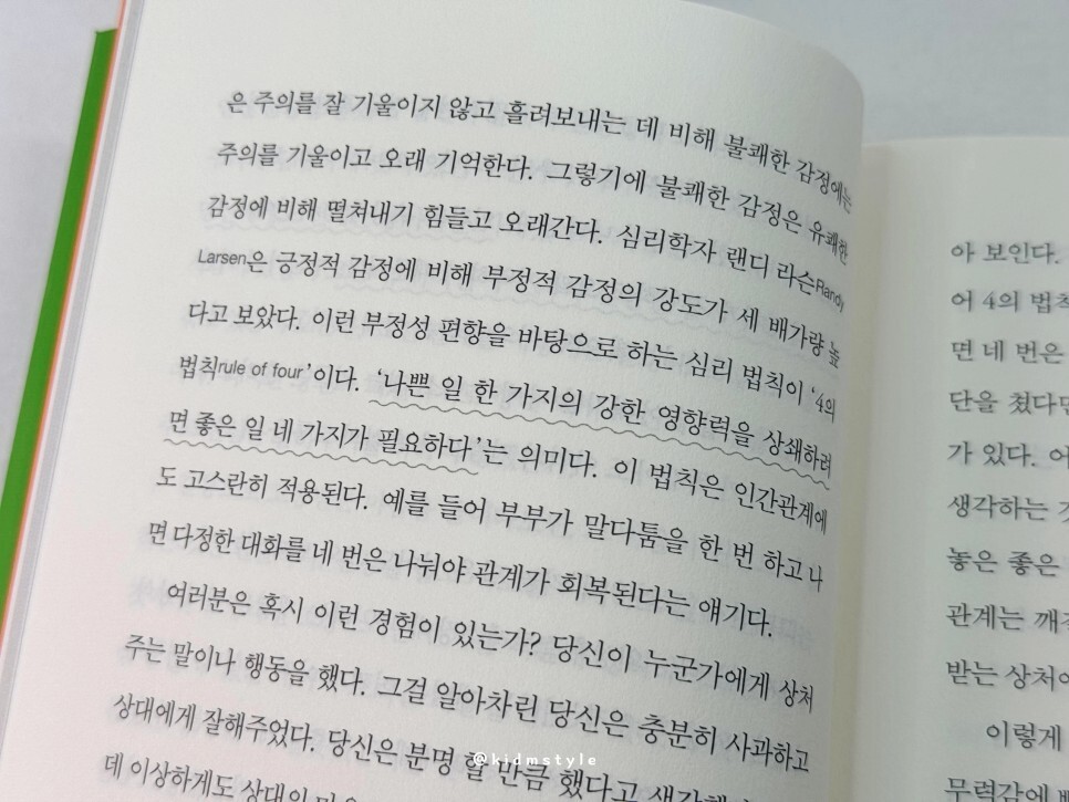 '나쁜 일 한 가지의 강한 영향력을 상쇄하려면 좋은 일 네 가지가 필요하다'라는 의미다. 아마 대부분 공감할 것이다.