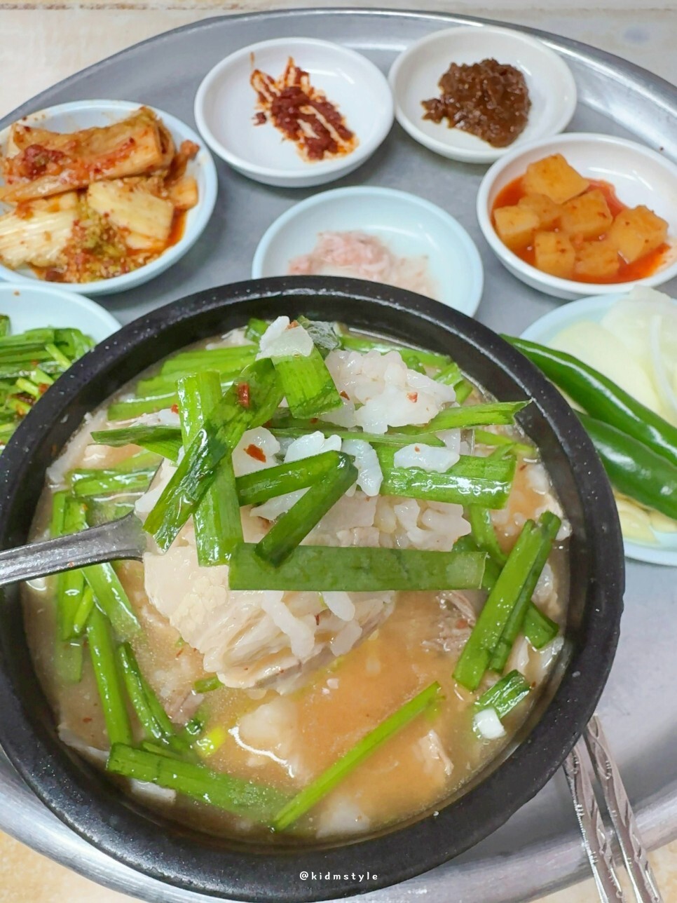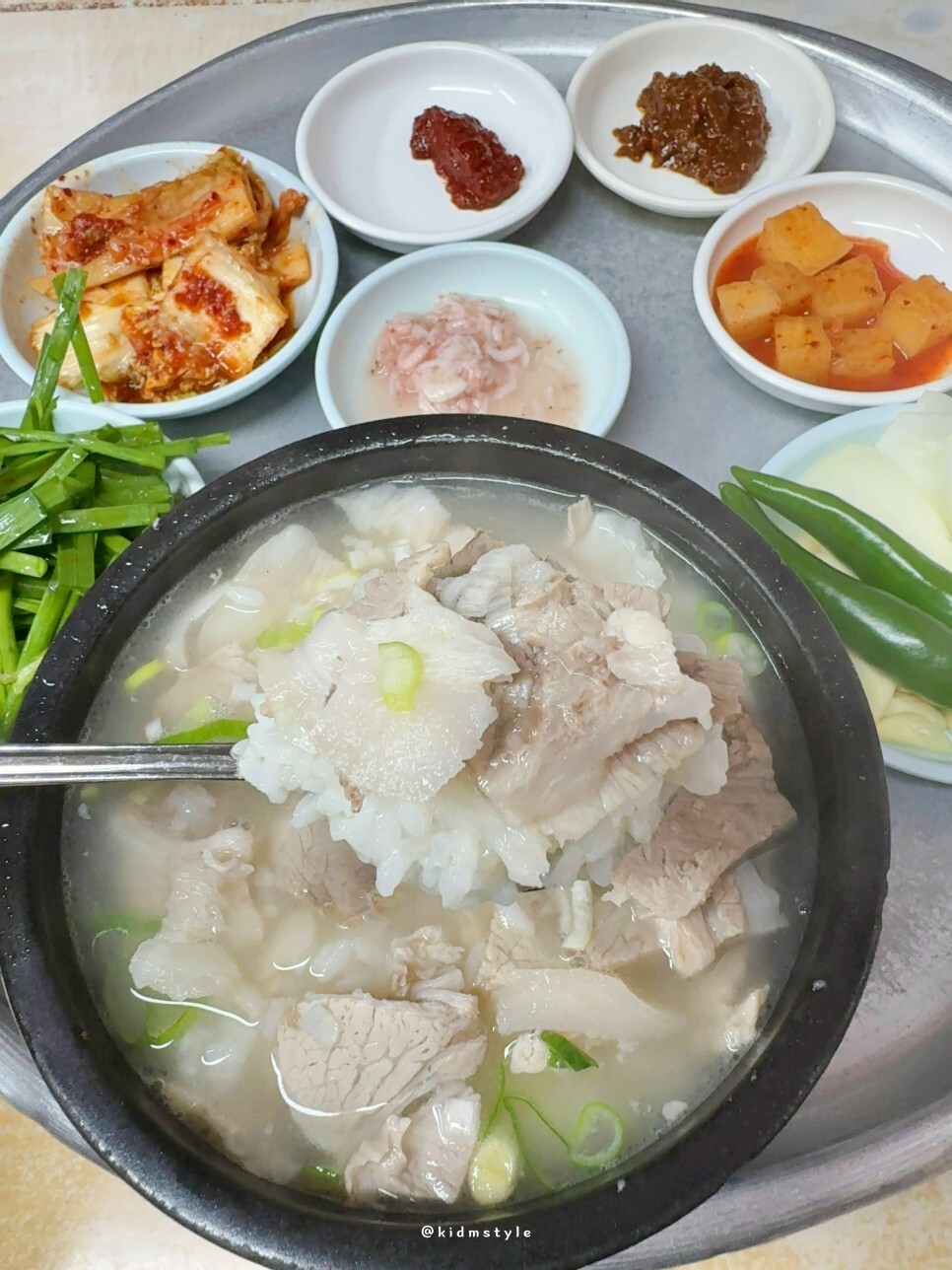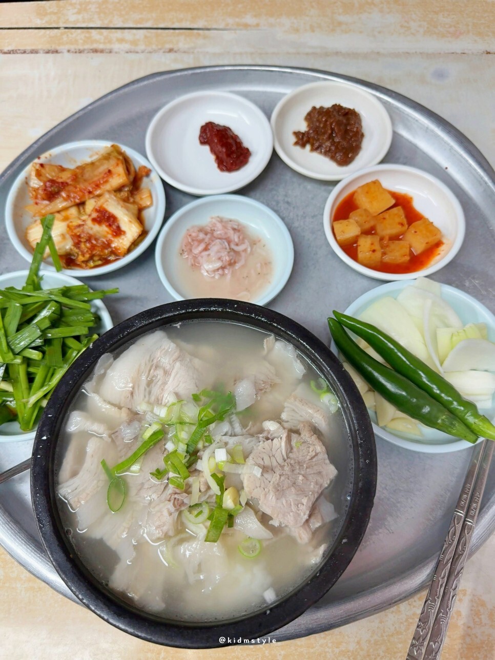 1인 혼밥이라 츄라이에 그대로 차려진 한 상이다. 참고로 이집 돼지국밥은 토렴식인데 정말 제대로 하는 토렴이다. 이전 포스팅에 보면 토렴 영상이 있다.