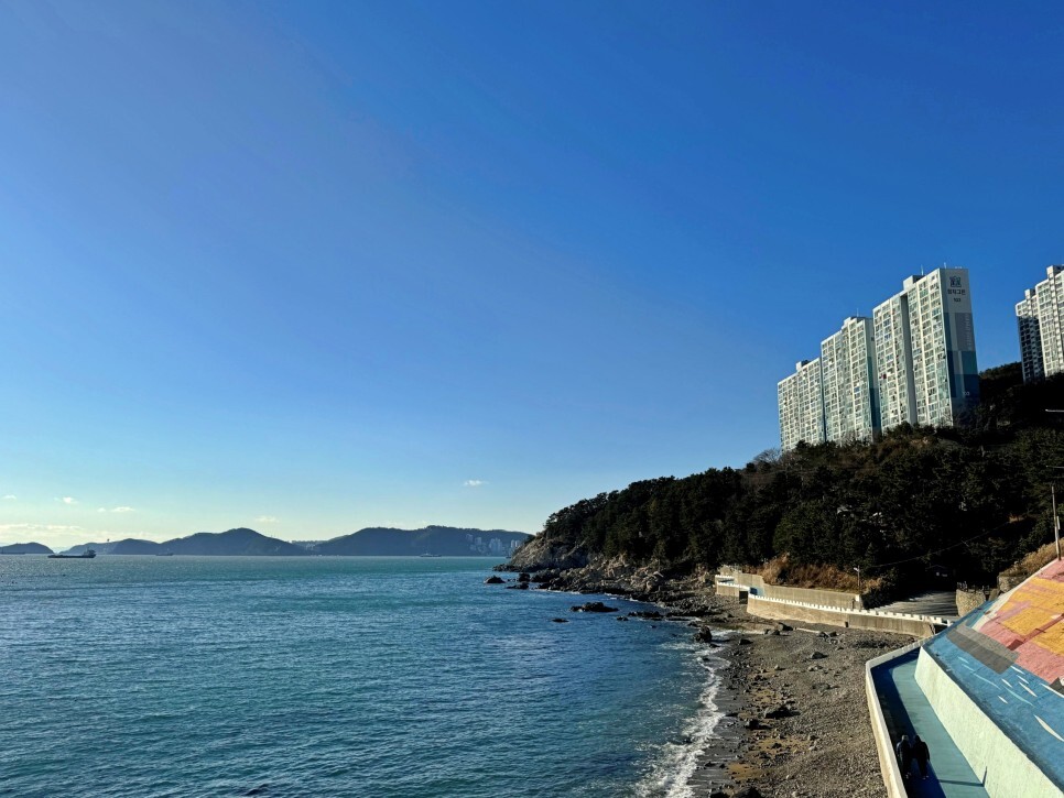 해안선 뒤로 보이는 동네가 송도에요. 흰여울문화마을 안내센터에서 출발하여 여기까지 2.5km 정도 거리입니다. 그리 길지 않죠? 왕복으로 걷기도 좋아요.