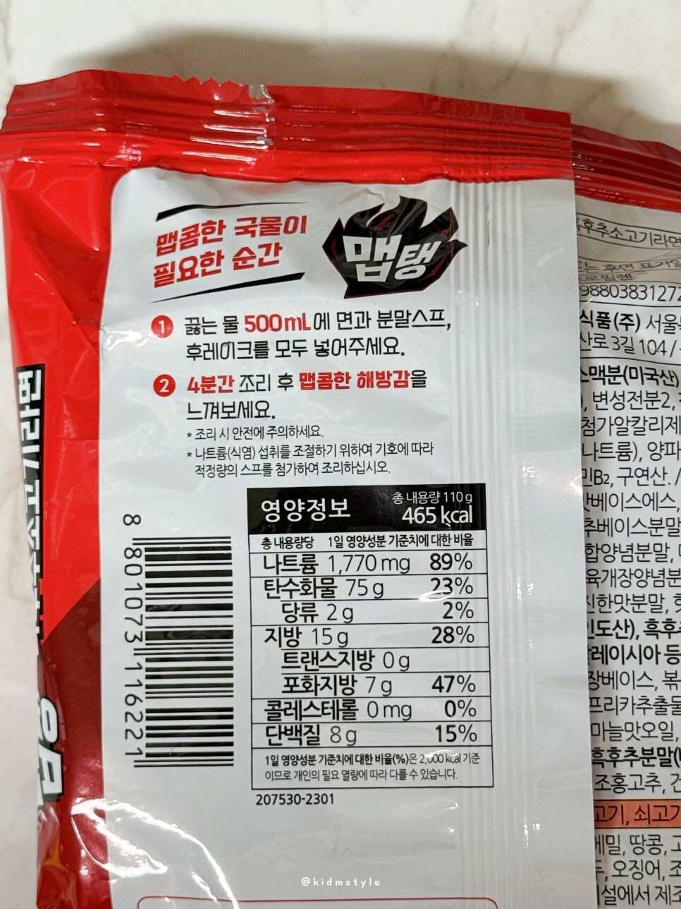 110g에 465kcal이다. 분말스프 중 흑후추 0.286%, 소고기 0.077% 함유!