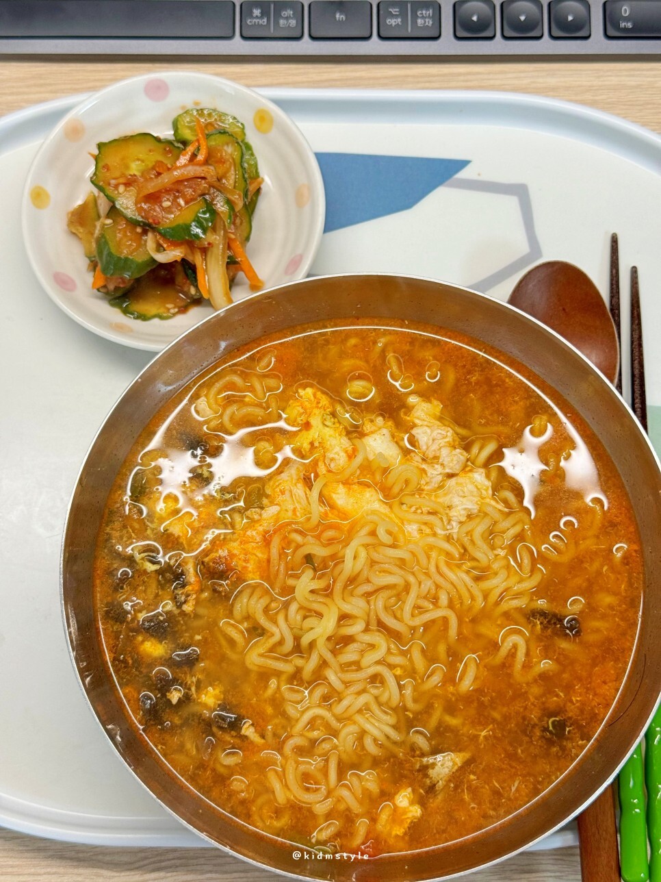 며칠 전에 만들었던 오이무침을 반찬으로 라면 한 그릇 세팅 끝