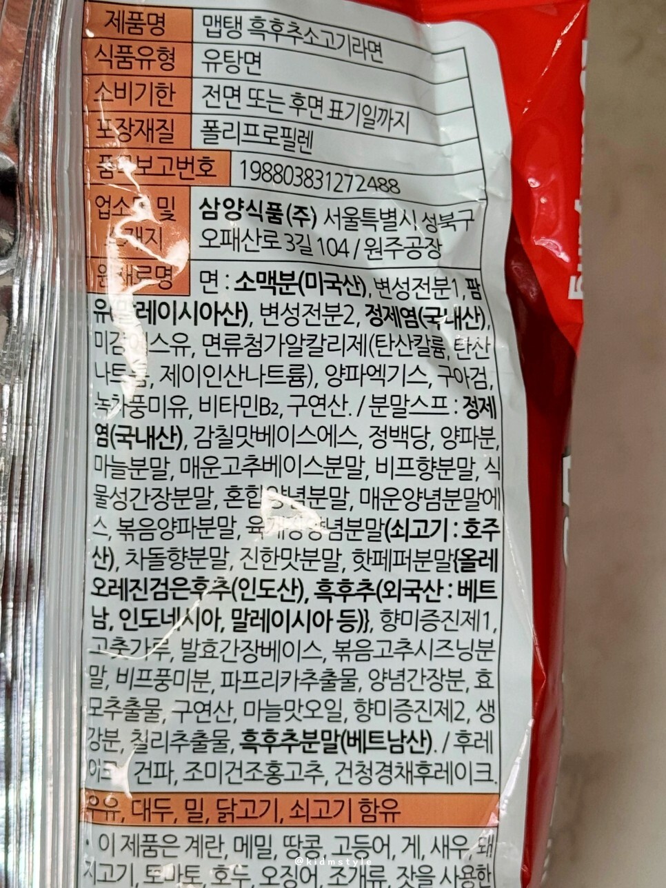 원재료명 참고 수입산 핫페퍼분말과 흑후추가 눈에 띈다.