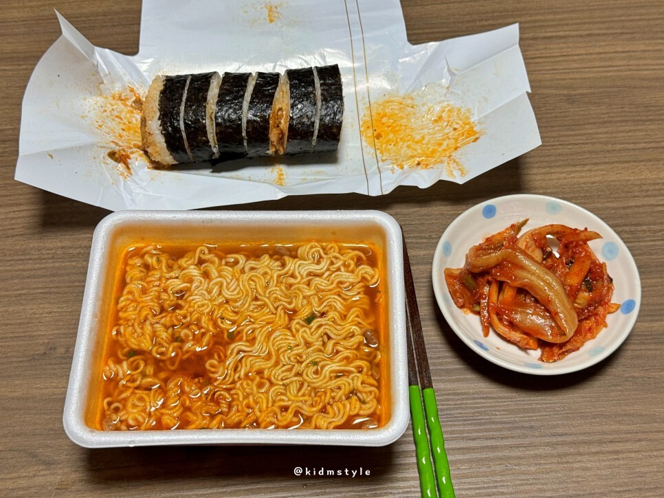 김밥은 라면과 함께 먹으면 정말 맛있으니 가볍게 오늘 저녁은 컵라면에 김밥 조합으로 간다. 며칠 전 본가에서 얻어온 김장김치도 빠질 수 없다.