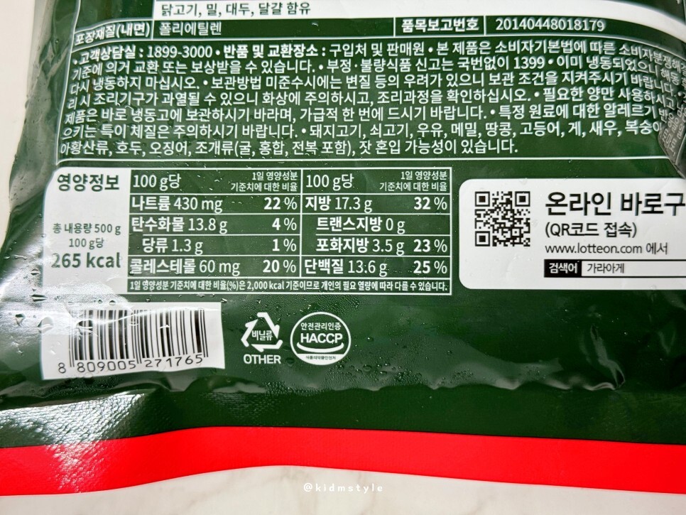 상신종합식품이라는 곳에서 제조하였다. 브라질산 닭다리살이 주 재료이다.