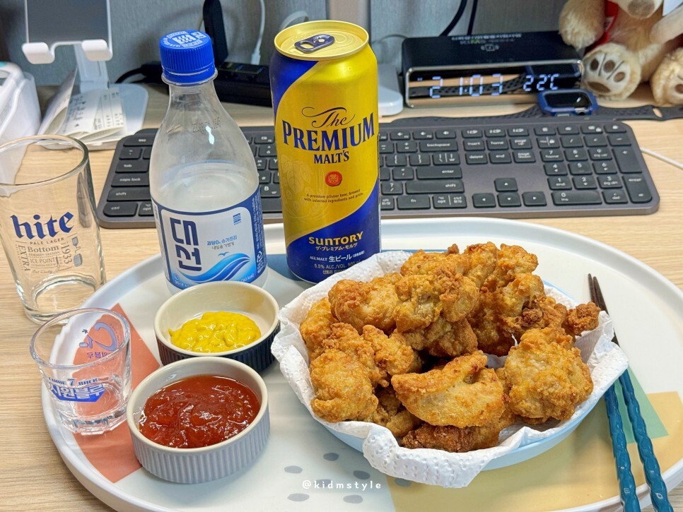 가볍게 한잔하기 위해서 차려보았다. 소스는 치킨 시켜 먹고 남은 양념 소스와 머스타드 소스