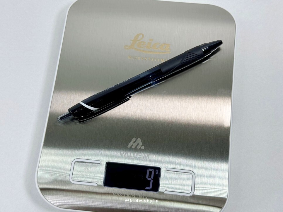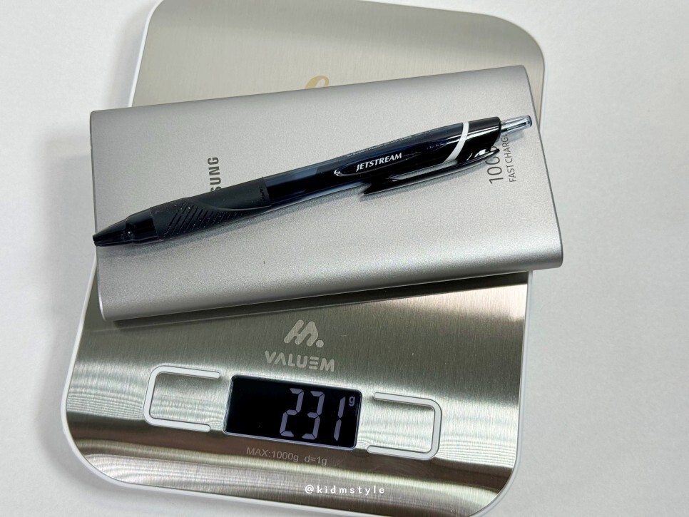 1kg 이하의 다양한 제품의 무게를 측정할 수 있다. 제트스트림 볼펜을 올려본다.