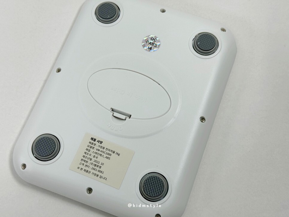 저울의 하단의 모습이다. 가운데에 뚜껑을 열고 전지를 넣으면 된다.