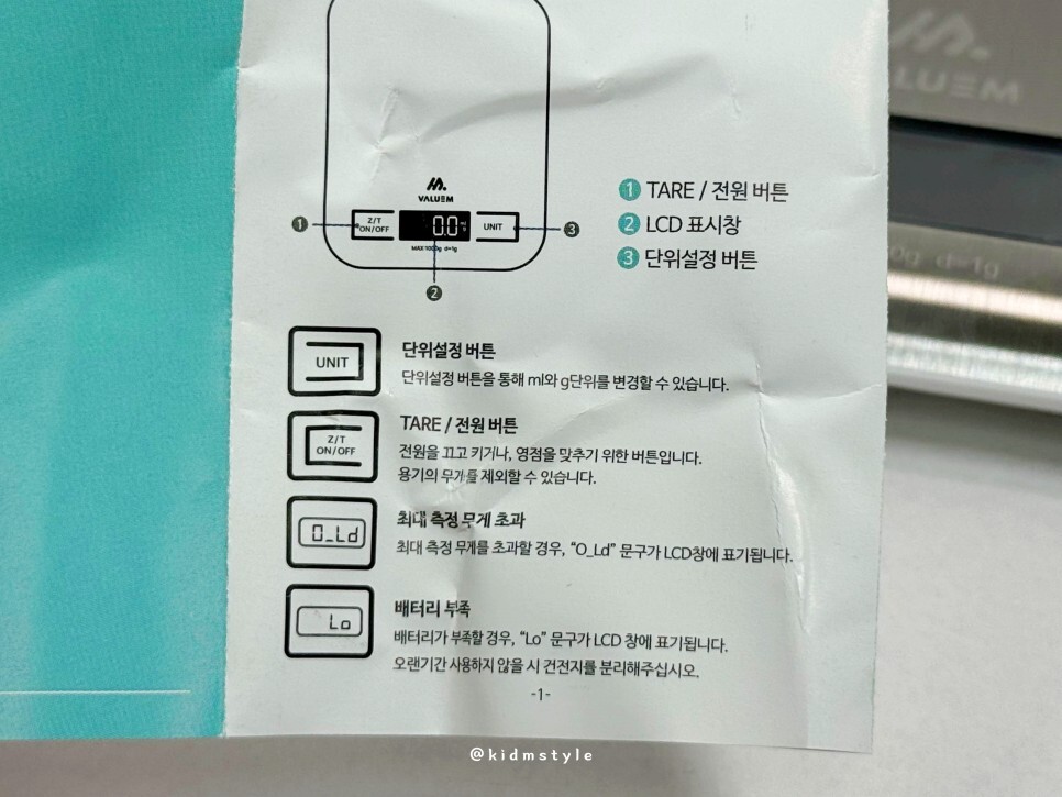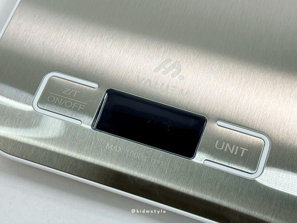 최대 적재 무게는 1kg이며 tare 기능이라고 용기를 올리고 무게를 측정할 수 있다. 아주 편한 기능이다.