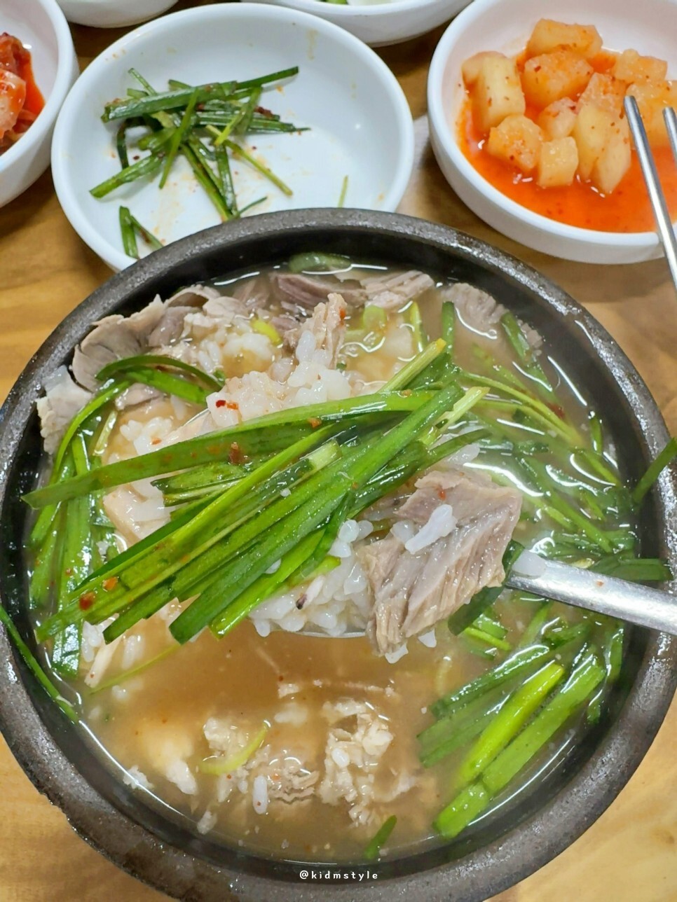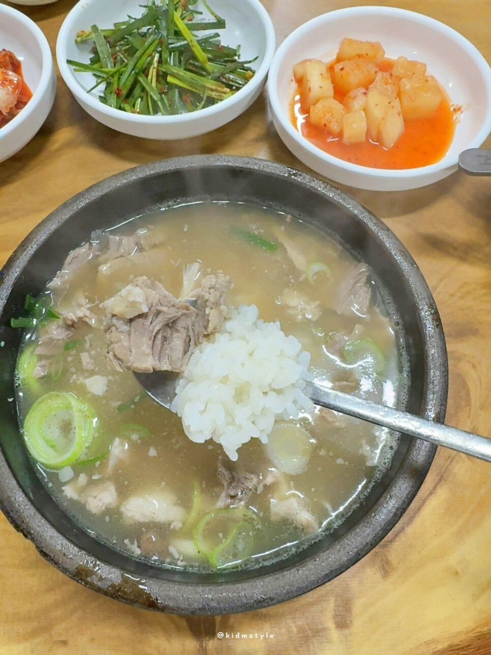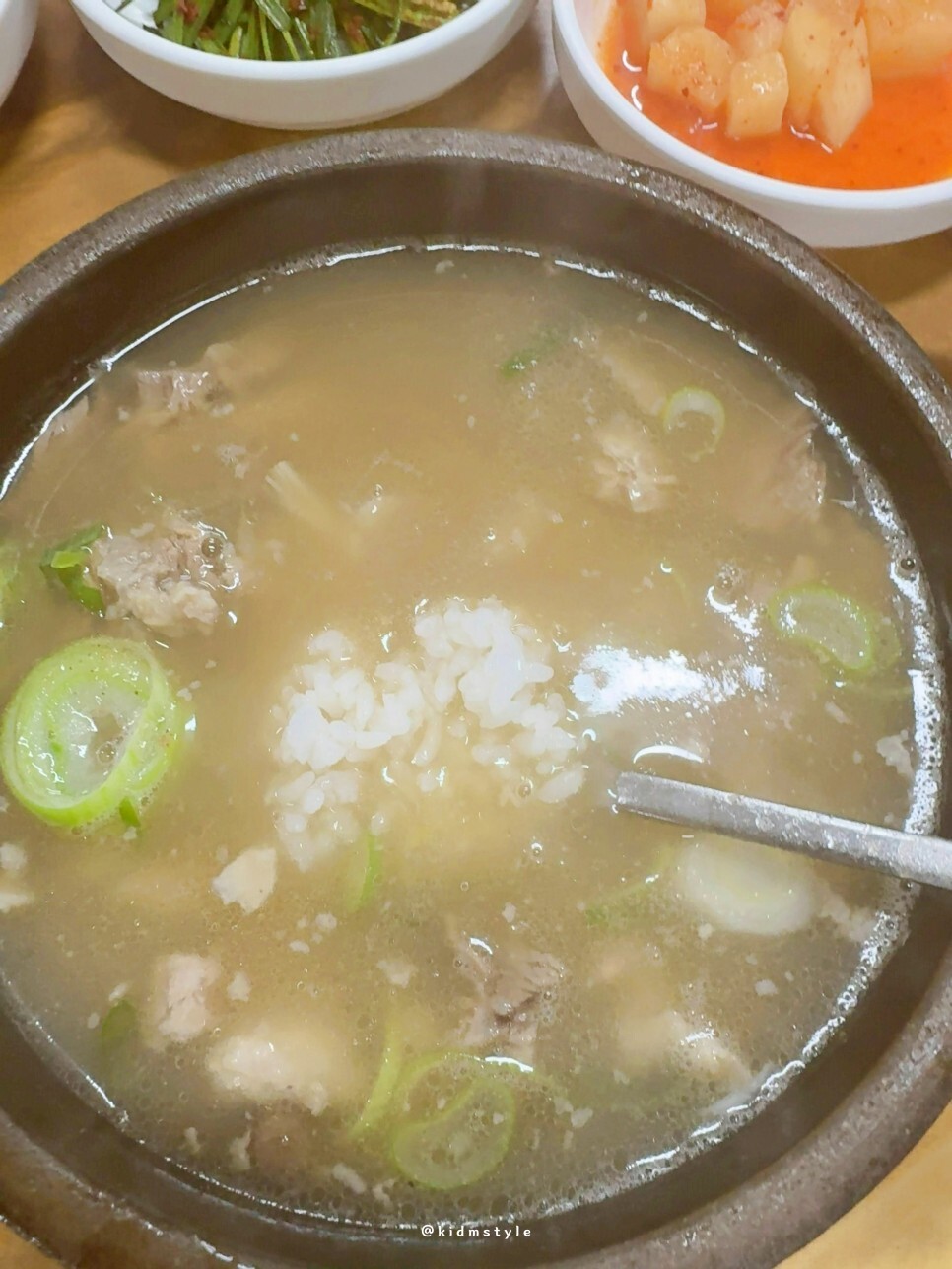 밥을 한 숟가락 국물에 적시고 떠먹는다. 아직까지 엄청 뜨거운 상황이라 호호 불어가며 먹게 된다.