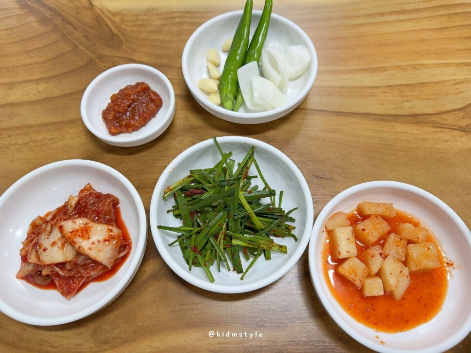 반찬은 이렇다. 마늘 꼭다리 제거나 재료 손질이 마음에 들고 부추는 신선하다. 사소하지만 유심히 보게 되는 부분이다.