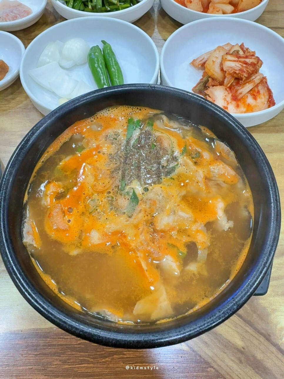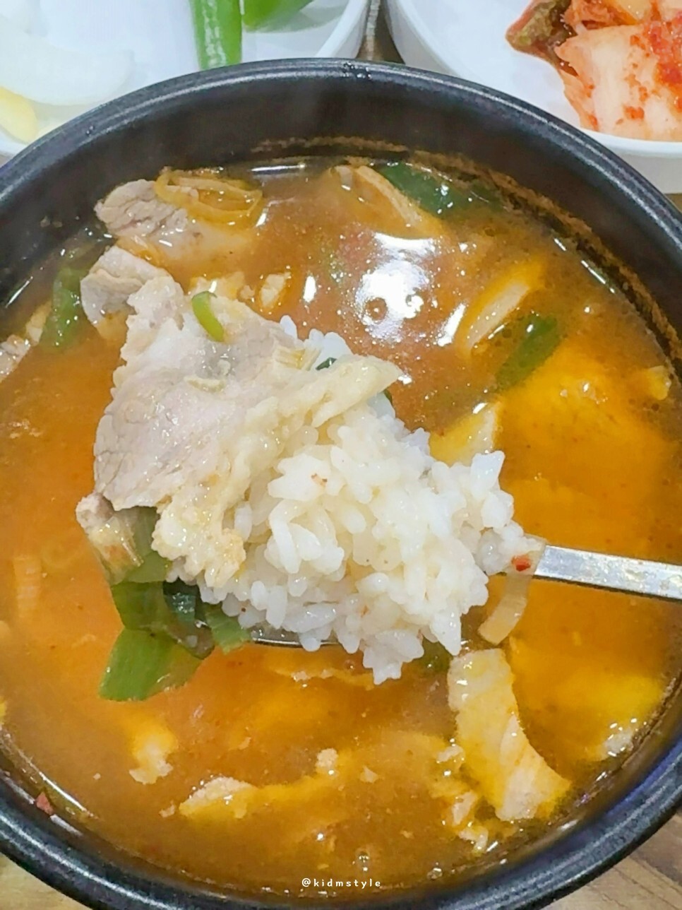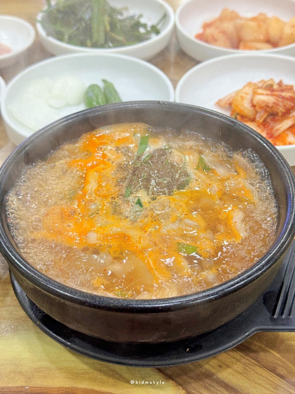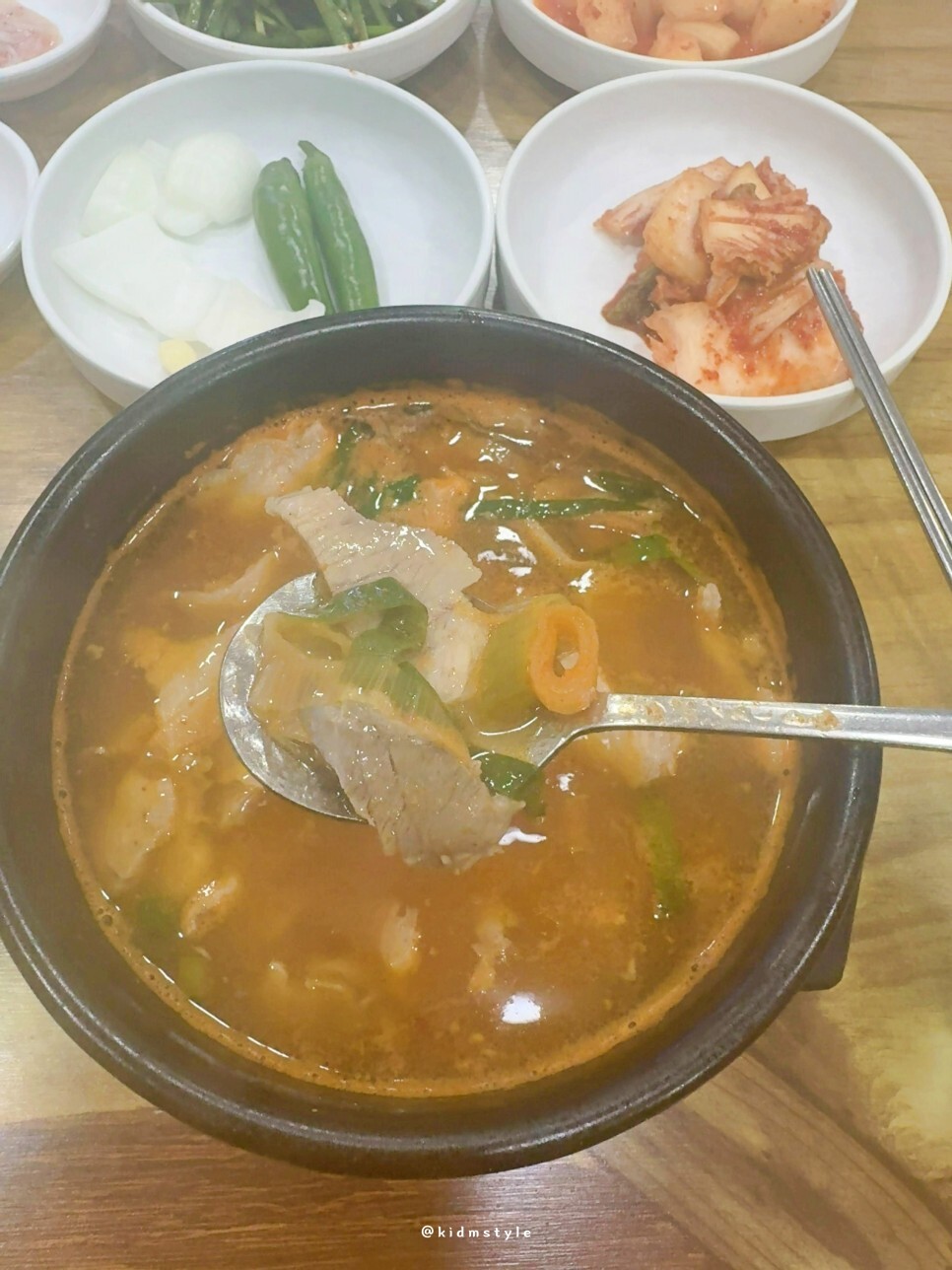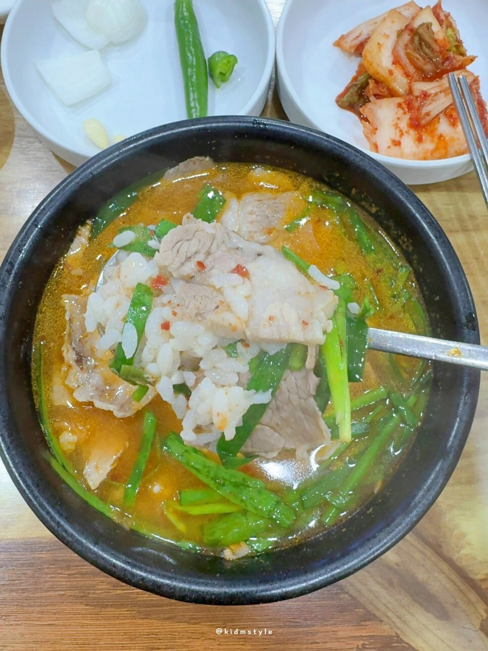 뜨끈한 국물에 푹 적신 밥 한 숟가락과 고기 한 점을 맛보니 그저 행복한 미소가 지어진다. 잡내 없는 고기, 고춧가루로 얼큰한 모습을 하고 있지만 생각보다 깔끔하면서 깊은 국물은 오늘 이 집에 찾아오기를 잘했다는 생각이 든다.