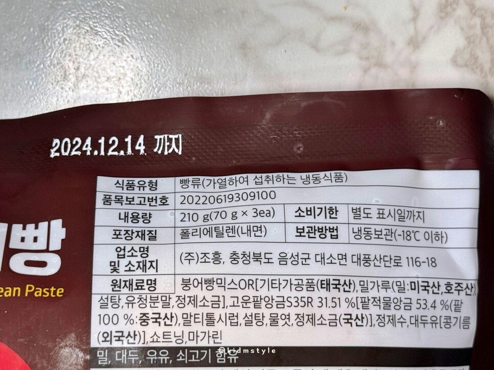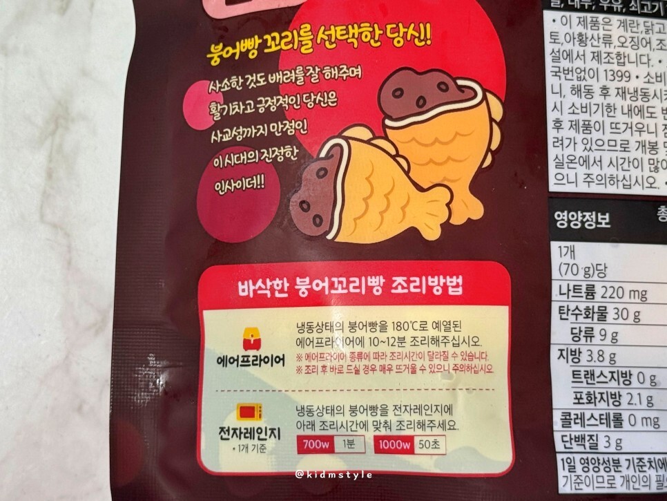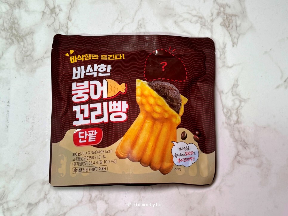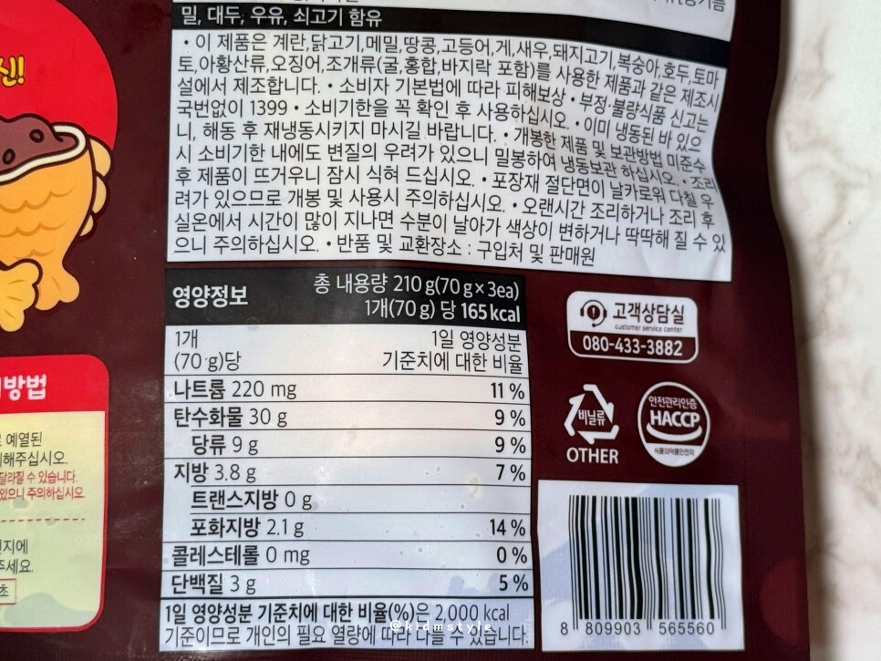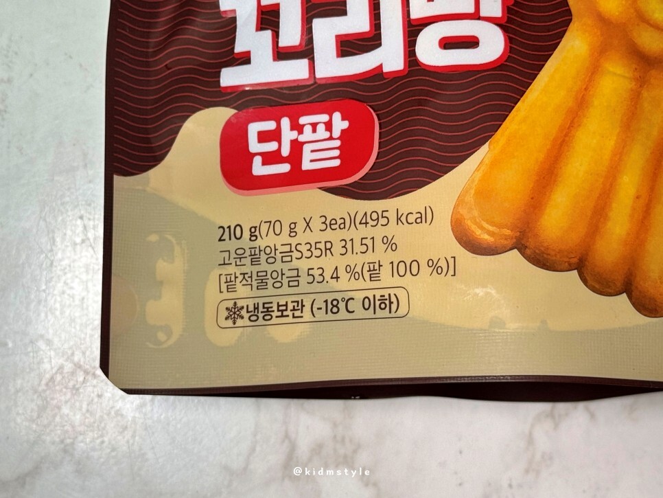 본 제품은 냉동 보관이다. 생선은 당연히 냉동 보관 아니겠나? 70g 짜리 붕어 꼬리빵이 3마리 들어가 있고 총 210g에 495kcal이다.