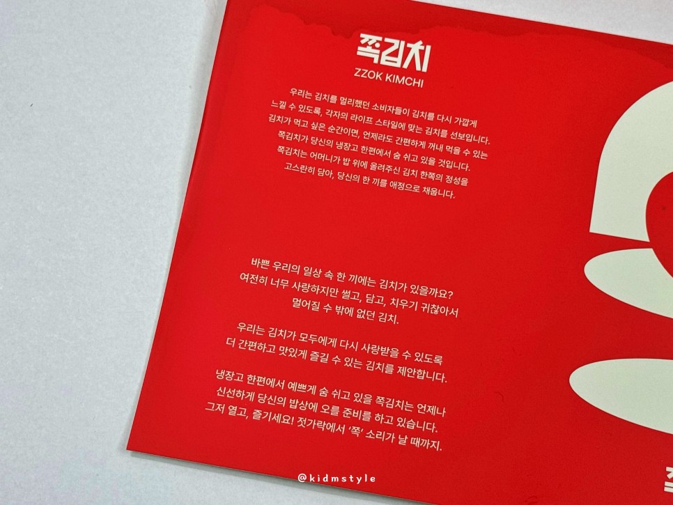 오늘 소개해 드린 쪽김치는 캠핑이나 여행, 나들이 등 야외 활동에서도 편리하게 맛볼 수 있고 김치가 그립지만 직접 만들어 먹기가 어려운 바쁜 1인 가구, 2인 가구에도 적절한 선택지가 될 것 같다. 패키지가 깔끔해서 선물용으로도 괜찮을 것이다.