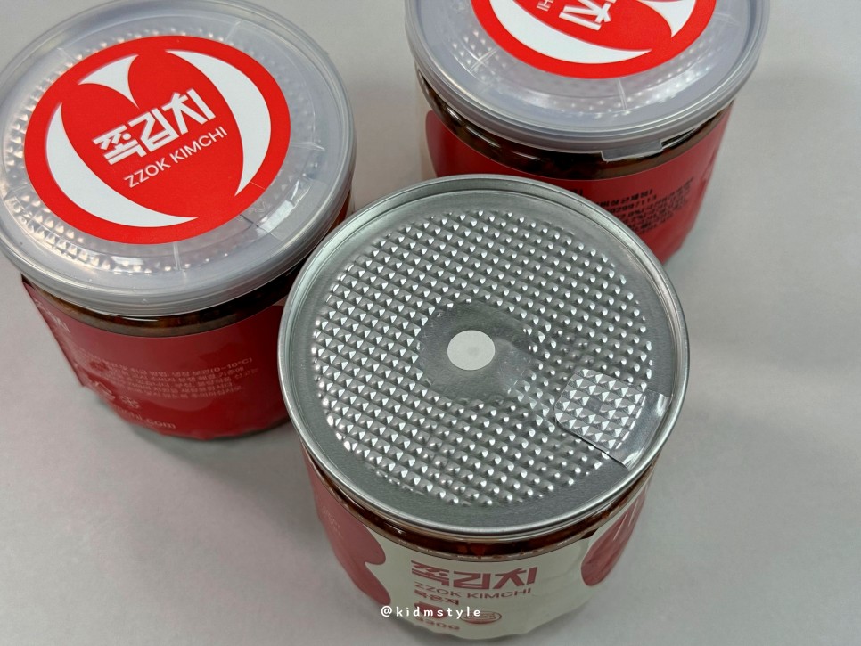 보다시피 알루미늄 원터치 뚜껑을 사용하였다. 가운데 하얀 필름이 보이는데 특수 멤브레인 필름은 김치에서 생성되는 발효 가스를 외부로 효과적으로 배출하며 액체는 완벽하게 차단, 안전한 보존을 가능하게 한다.