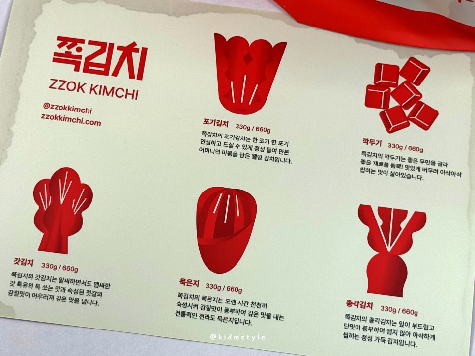 쪽김치는 포기김치, 깍두기, 갓김치, 묵은지, 총각김치 등 다양한 종류로 판매하고 있다. 330g 짜리와 660g 두 가지 용량을 선택할 수 있으니 상황과 취향에 따라 구입하면 될 것 같다.