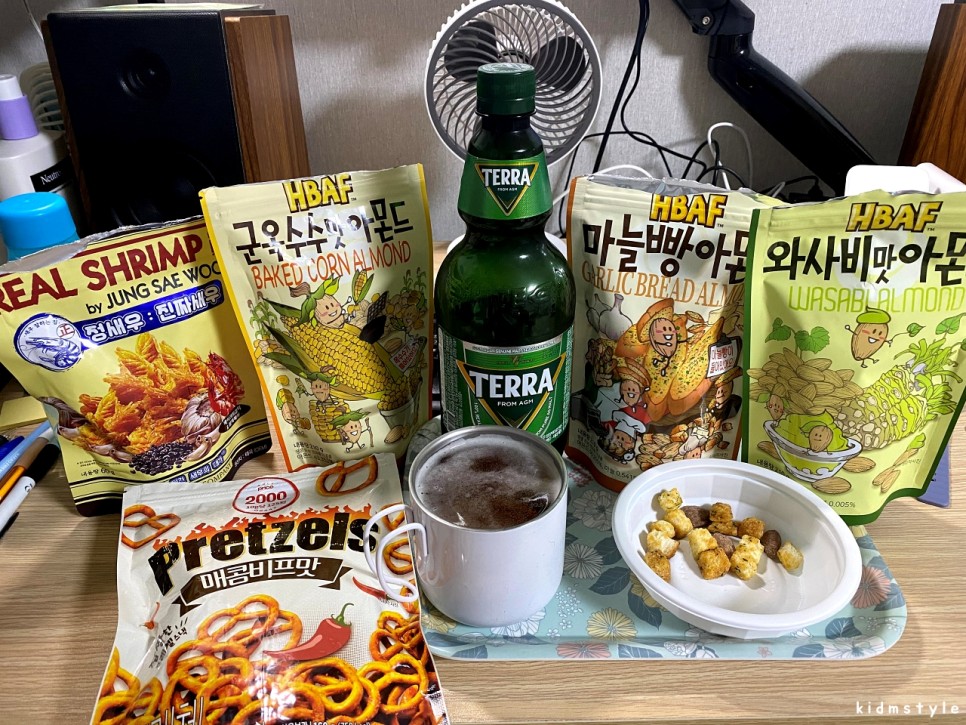 그리고 오늘 소개할 바프 군옥수수맛 아몬드와 롯데마트 자체 상품인 프레첼 매콤비프맛이다.