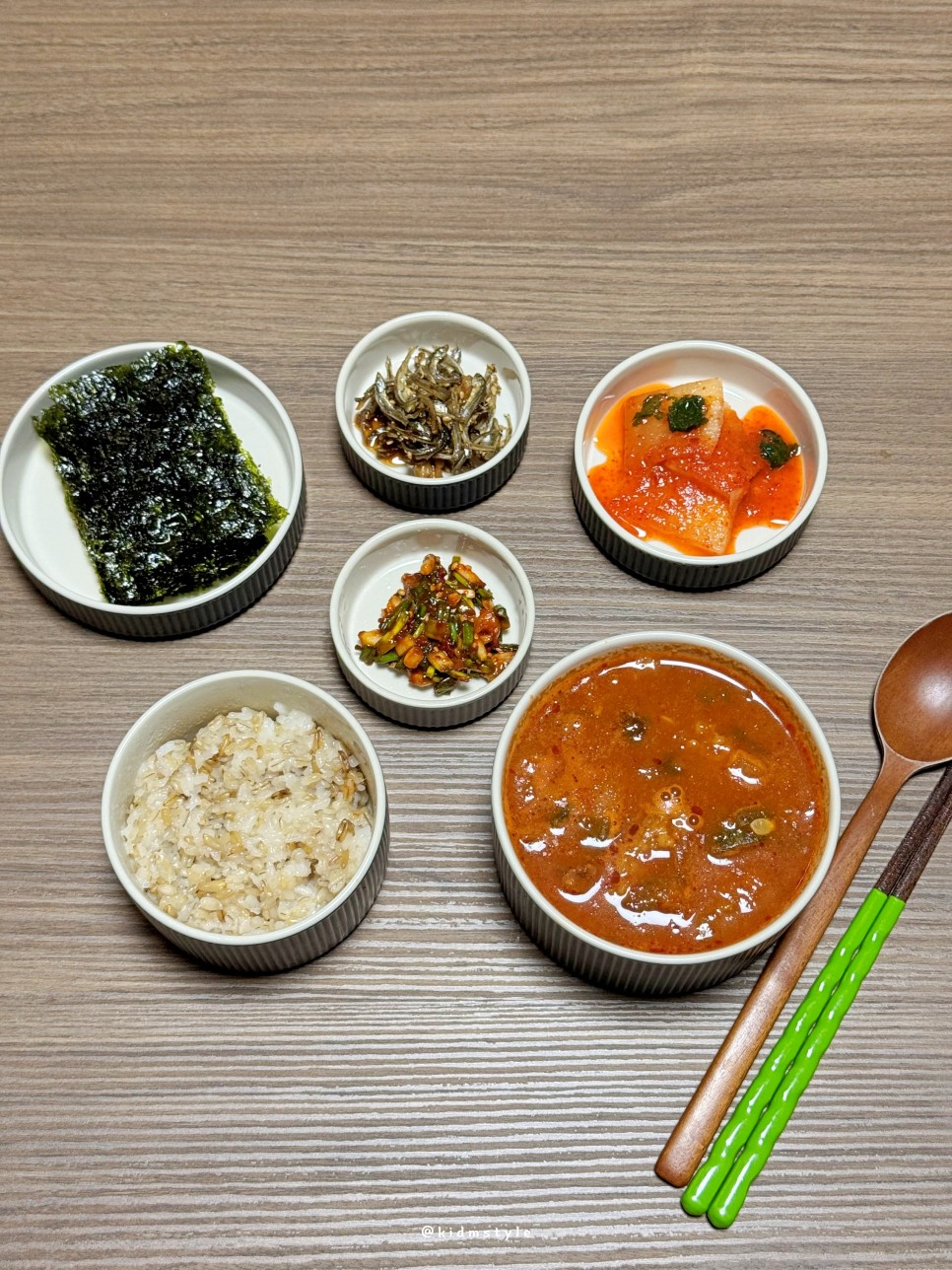 간단하게 차려 보았다. 조미김, 멸치볶음, 섞박지, 잔파무침 그리고 귀리 현미 잡곡밥