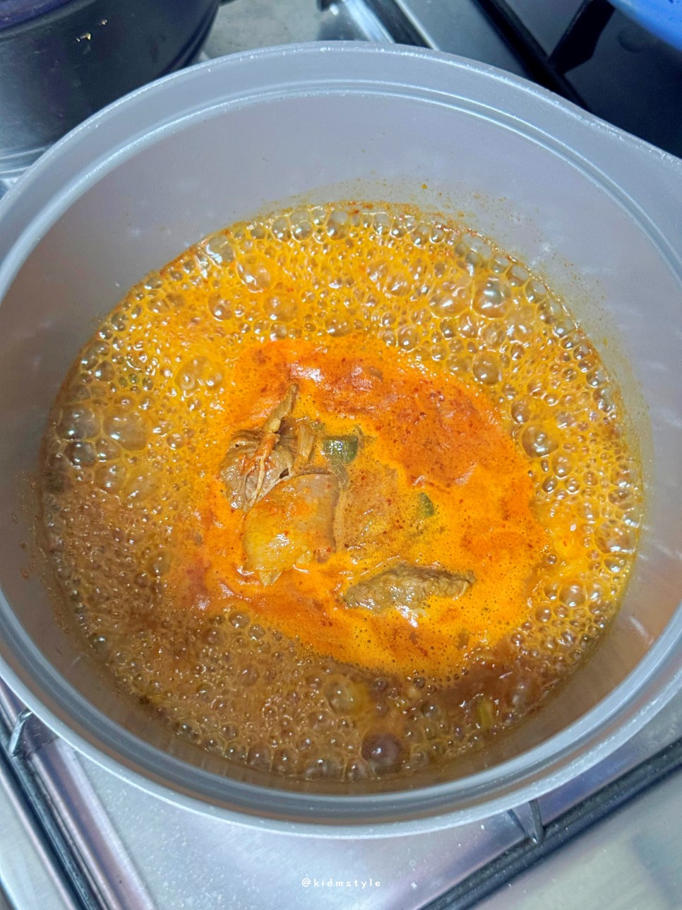 여기서 아주 간단한 팁 하나 방출한다. 냄비에 이런 국물류 부을 때 가스레인지 위에서 부으면 이리저리 빨간 국물 다 튀어서 닦아줘야 한다. 싱크대 볼에 내려놓고 부어보시라. 아주 깔끔하다. 주위에 튀는 건 어차피 설거지하니까.