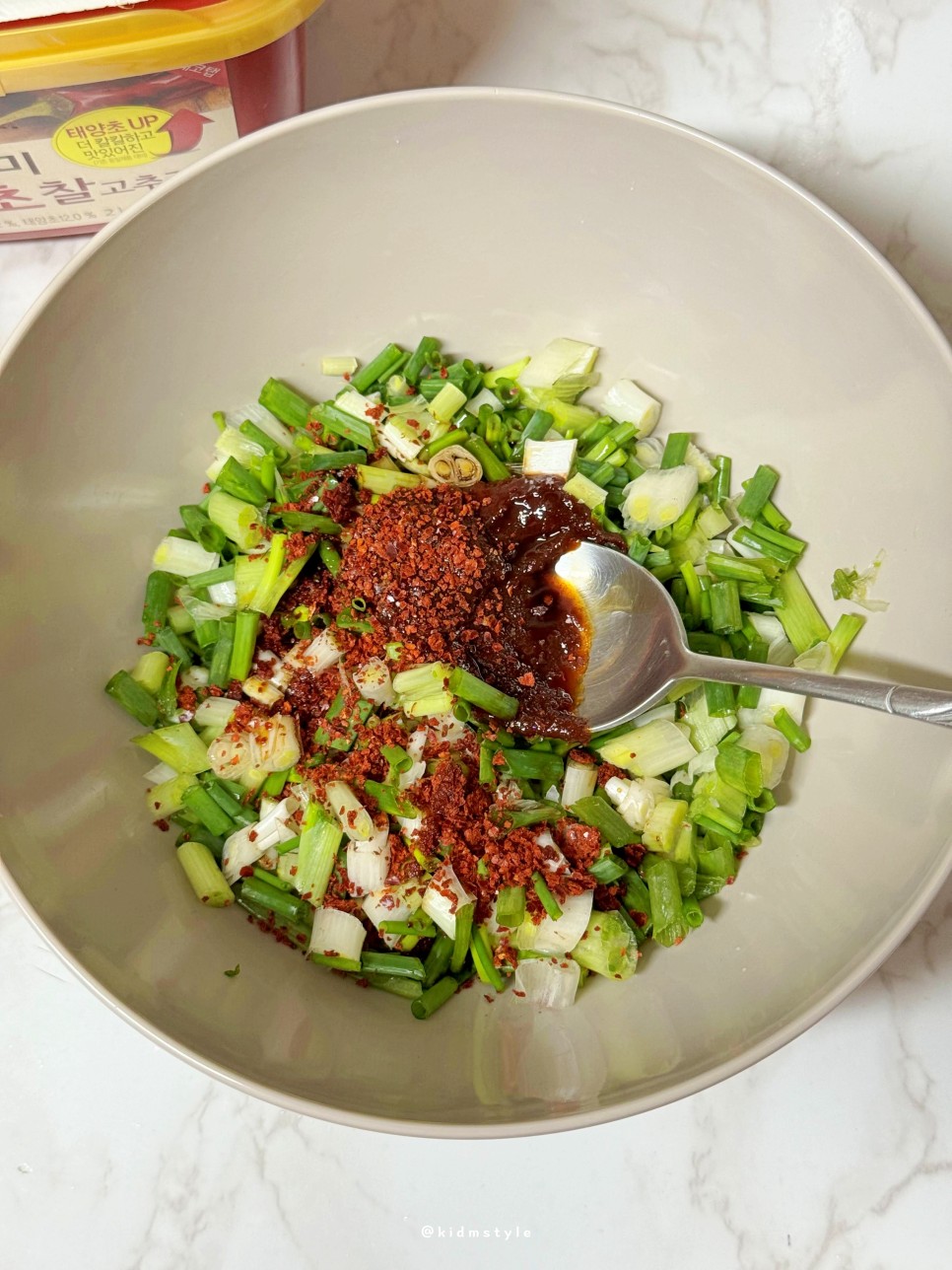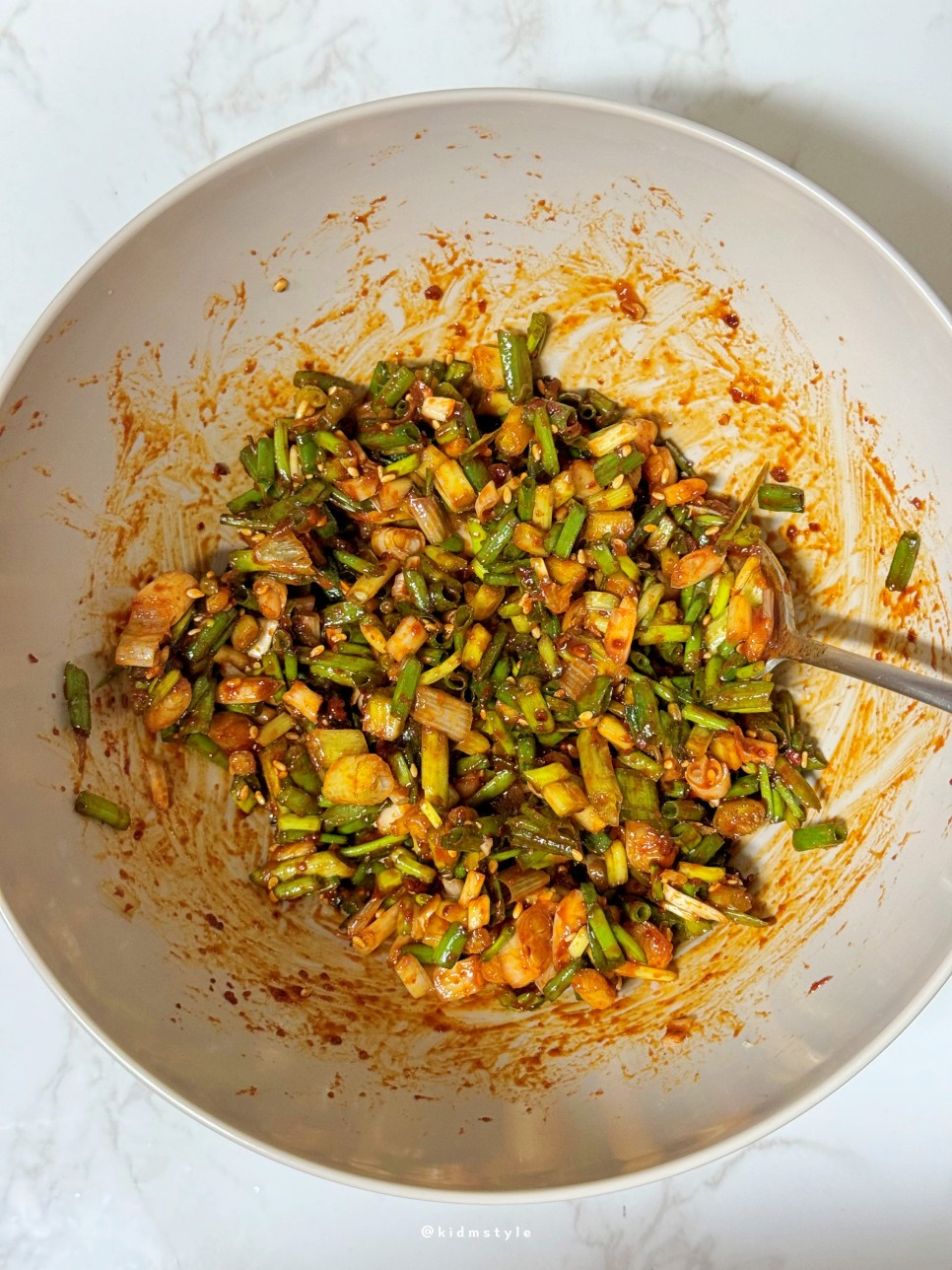그리고 숟가락 두 개 들고 열심히 섞고 비벼준다. 비닐장갑을 끼고 버무려줘도 되는데 귀찮아서 숟가락으로.