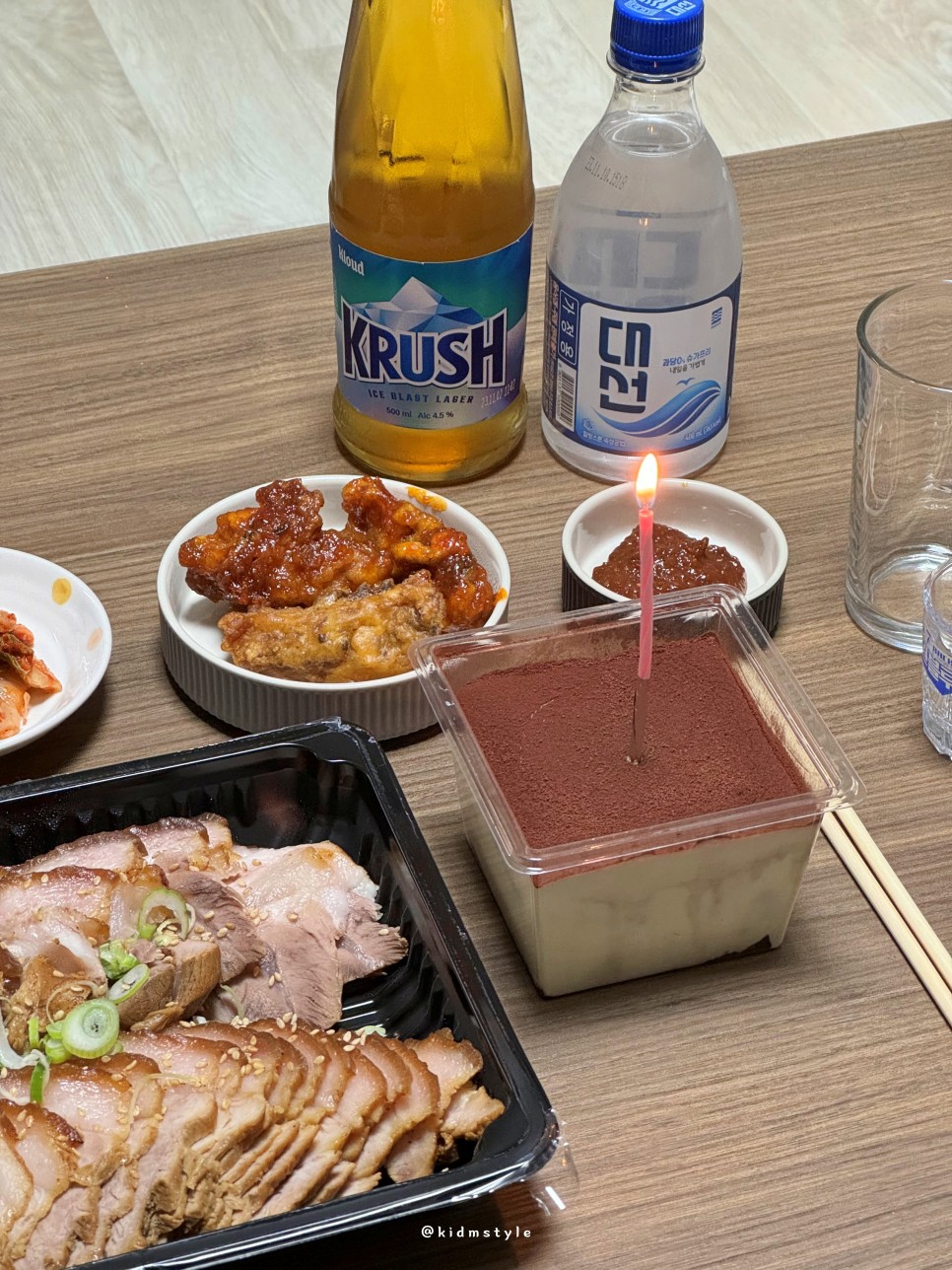 요건 크리스마스이브날 족발이랑 스타벅스 티라미수 사 와서 집에서 혼술 파티 때의 모습이다. 크러시와 대선의 소맥 조합도 괜찮다.