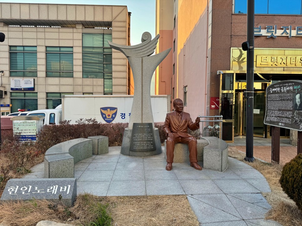영도대교를 넘어오면 바로 앞에 영도경찰서가 있는데요. 한쪽에 현인 노래비와 동상을 만날 수 있습니다. 스피커에서 음악도 계속 흘러나옵니다.