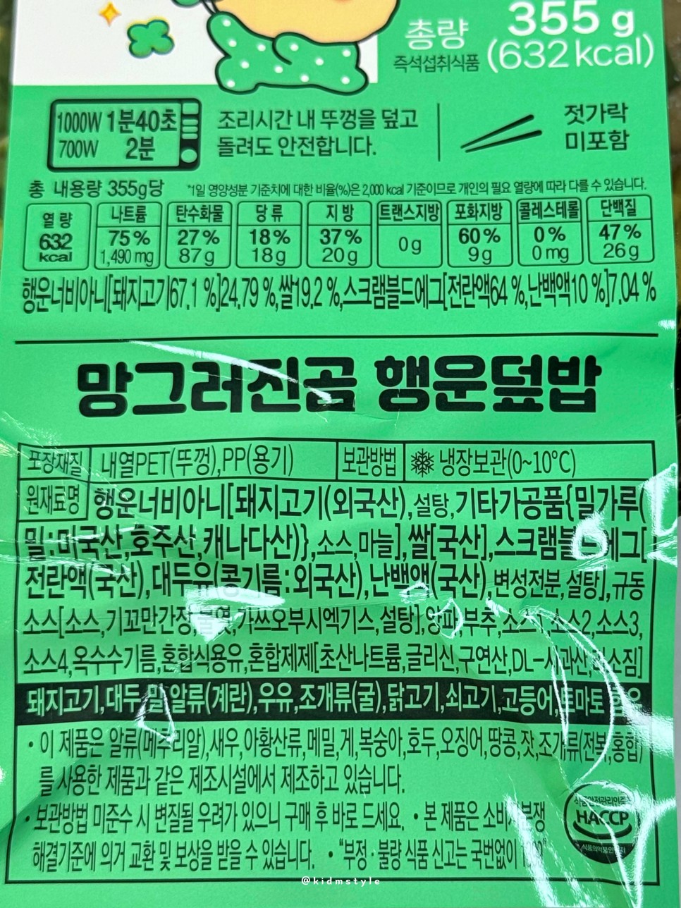 돈육, 계란, 농협쌀이 주 재료인 것 같고 총 355g에 632kcal이다.