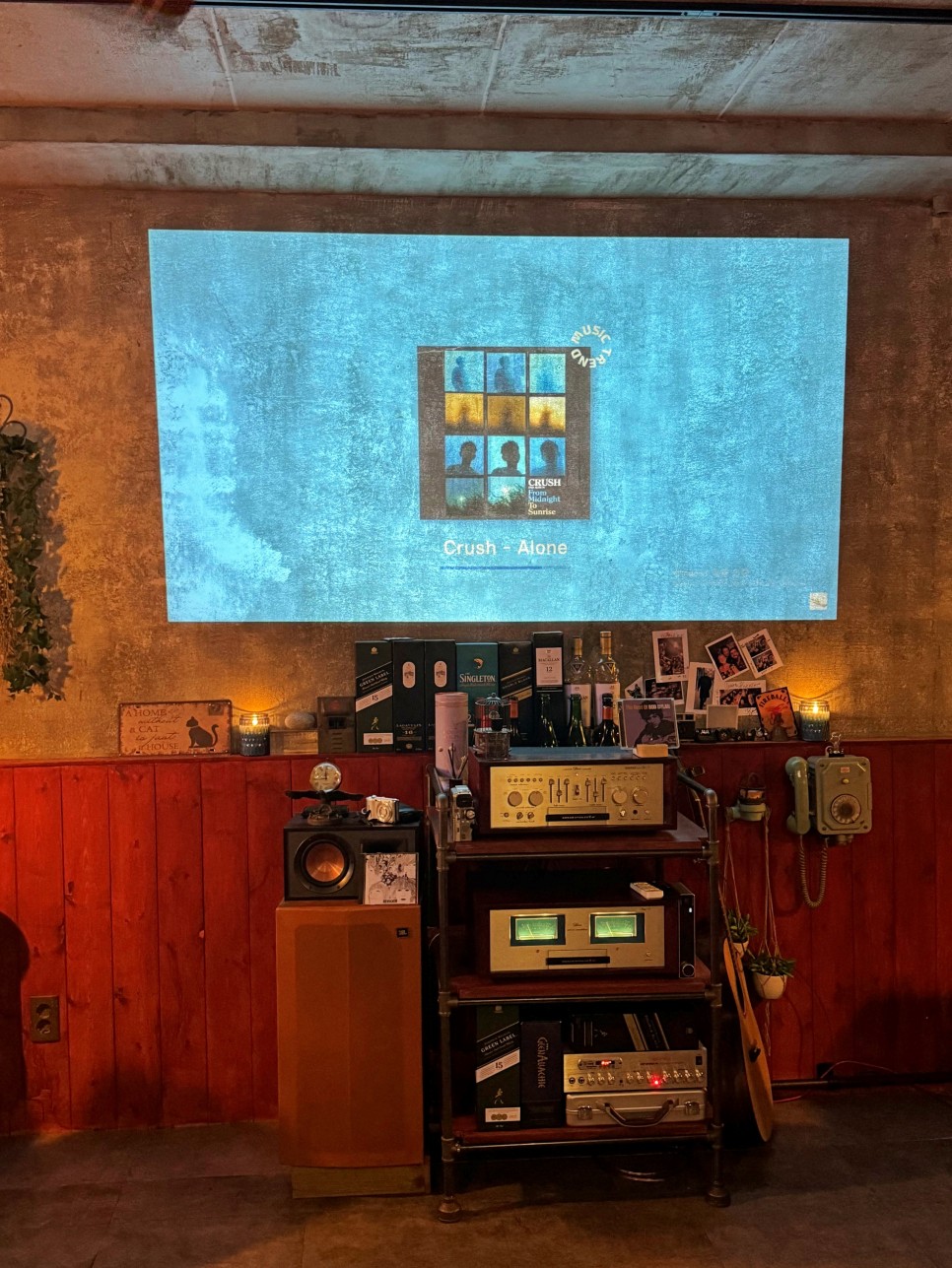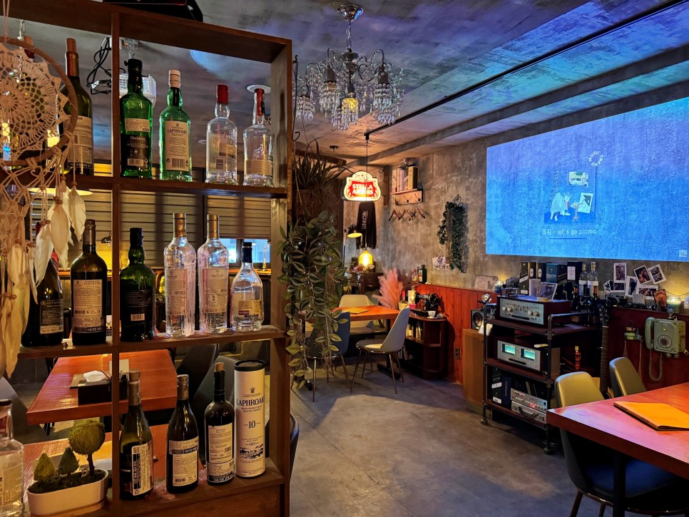 오래간만에 찾았는데 그 사이에 인테리어가 조금 바뀌었다. 얼핏 눈에 들어오는 빔프로젝터와 오디오.
