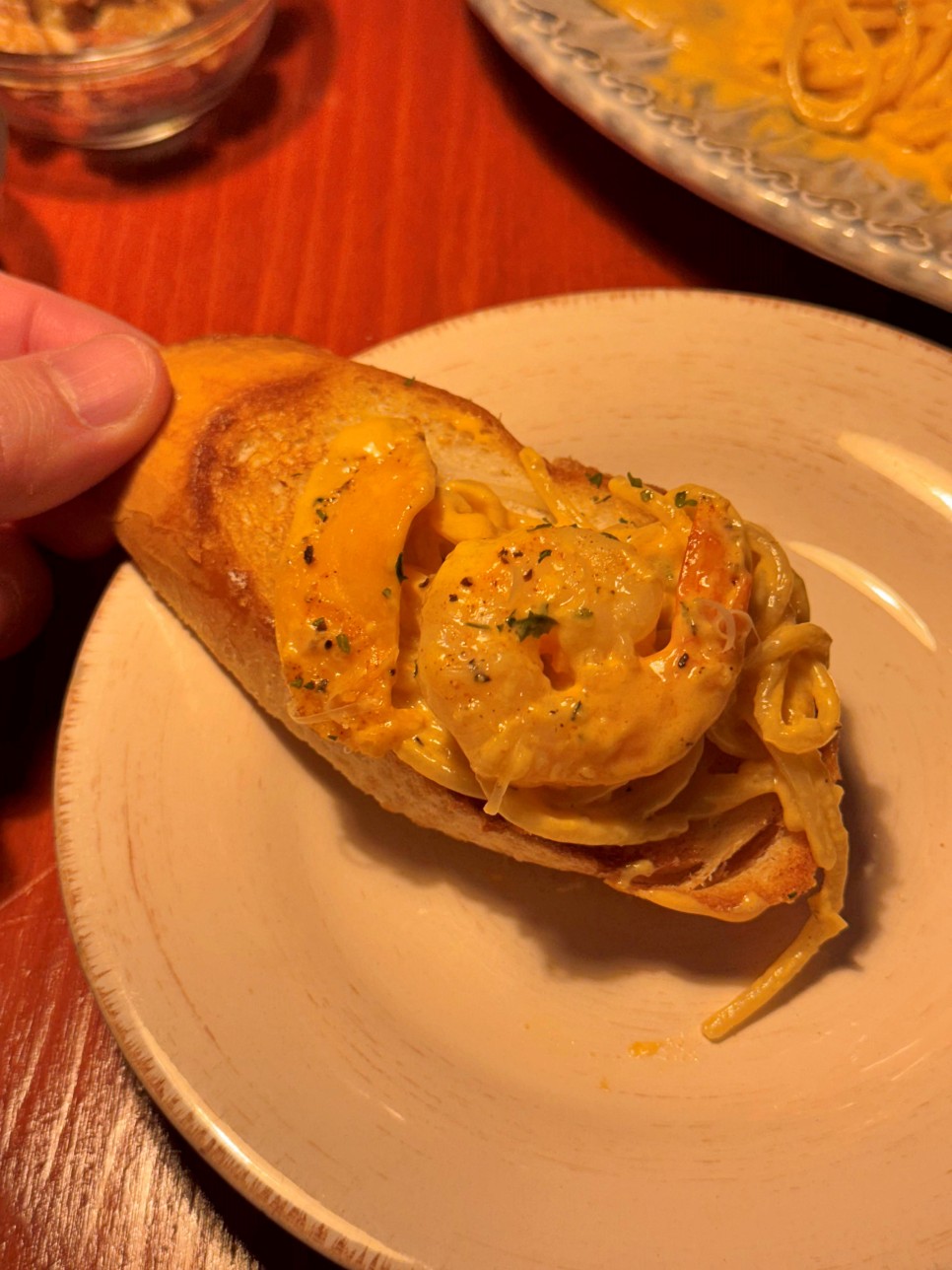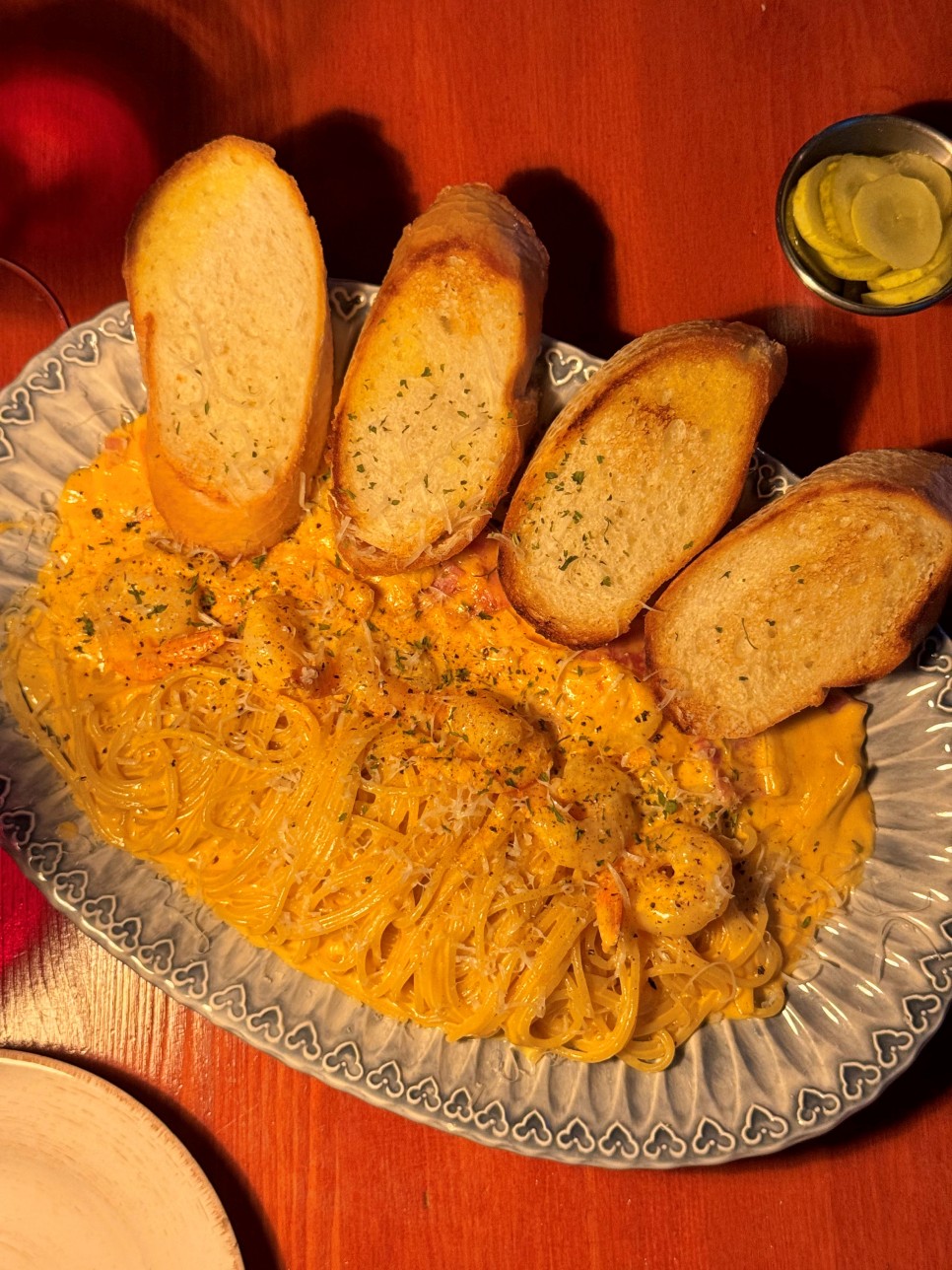 주문한 파스타가 나왔다. 크림 파스타를 좋아하는데 매콤한 것도 좋아한다. 칵테일 새우가 많이 들어가 있고 바게트도 같이 제공되니 한 끼로 딱 괜찮은 것 같다.
