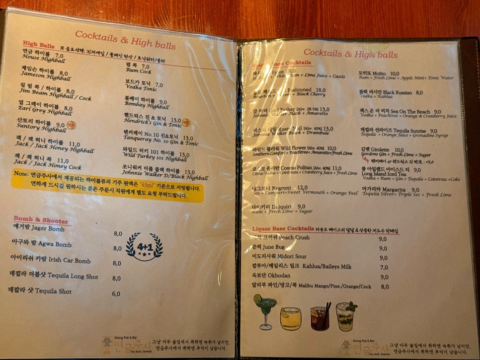 그리고 다양한 종류의 하이볼과 칵테일, 와인 등의 메뉴들이 있다. 메뉴를 여러 장 찍었는데 오류가 났는지 저장이 안 되었다.