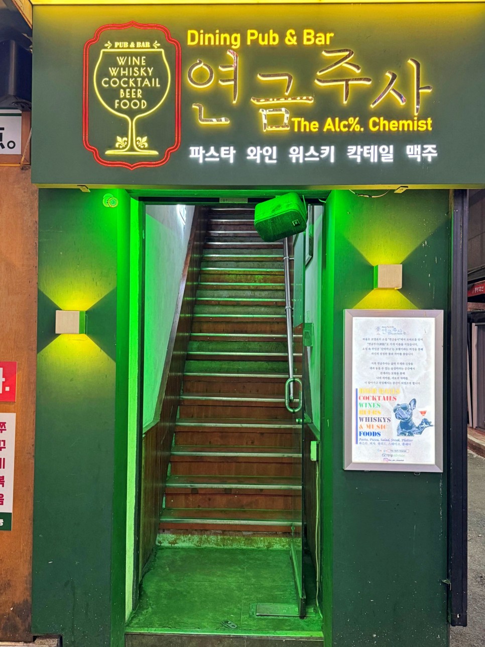 초록색 조명이 밝히는 계단으로 발걸음을 하나씩 내디디면 된다. 이곳은 예전에 몇 번 포스팅한 적이 있는 국제맥주였는데 몇 년 전 컨셉과 인테리어 등을 바꾸고 연금주사라는 새로운 모습으로 영업을 하고 있는 곳이다. 물론 사장님은 같은 분이다.
