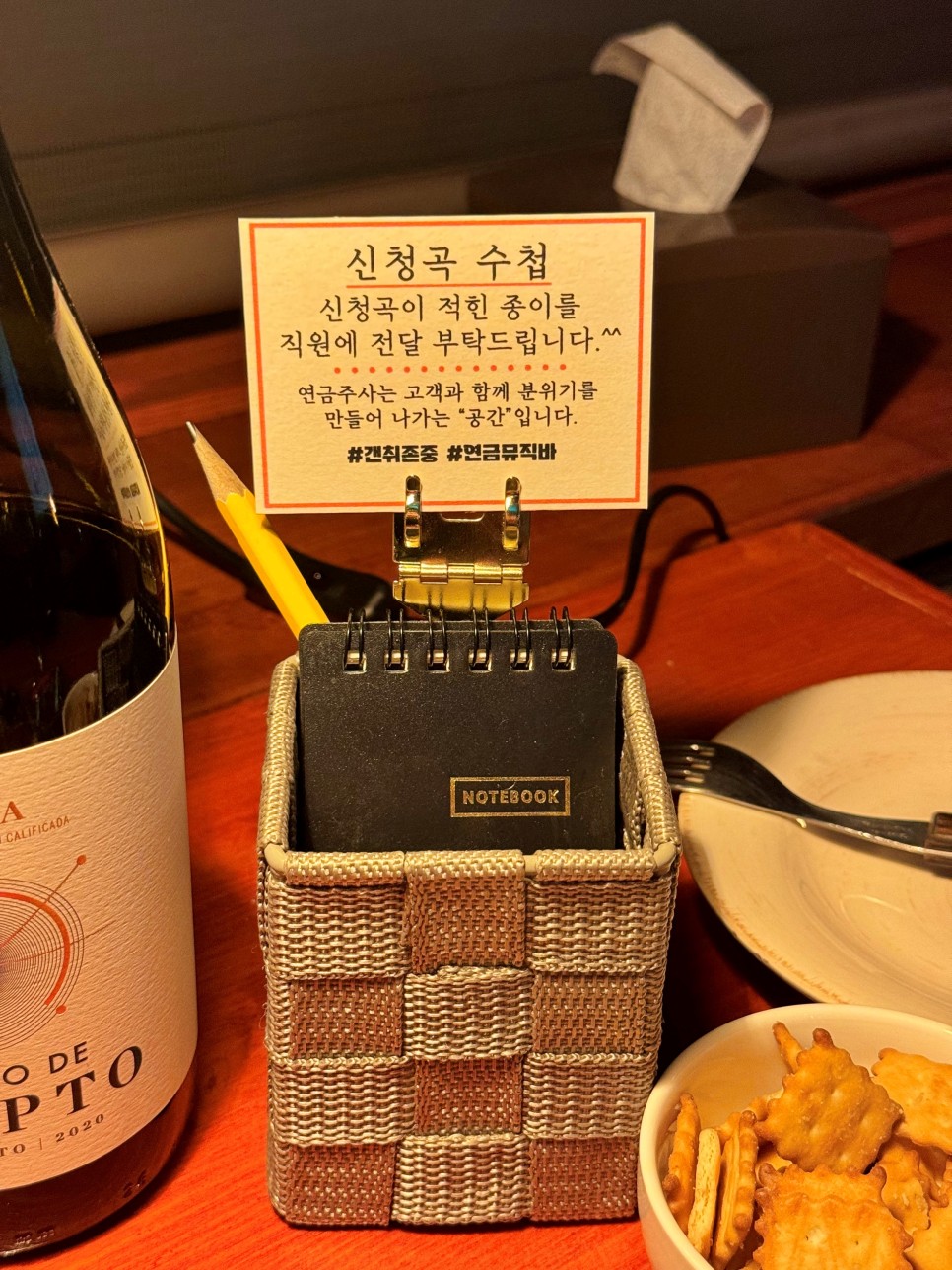 혼술이다 보니 음악도 듣고 이런저런 생각도 하고 가끔씩 형님과 대화도 하고 그렇게 시간이 흘러간다. 나도 신청곡 하나 넣고 싶어서 수첩을 펼쳤다.