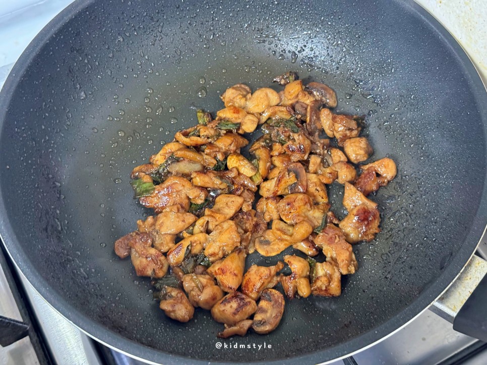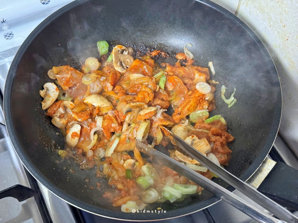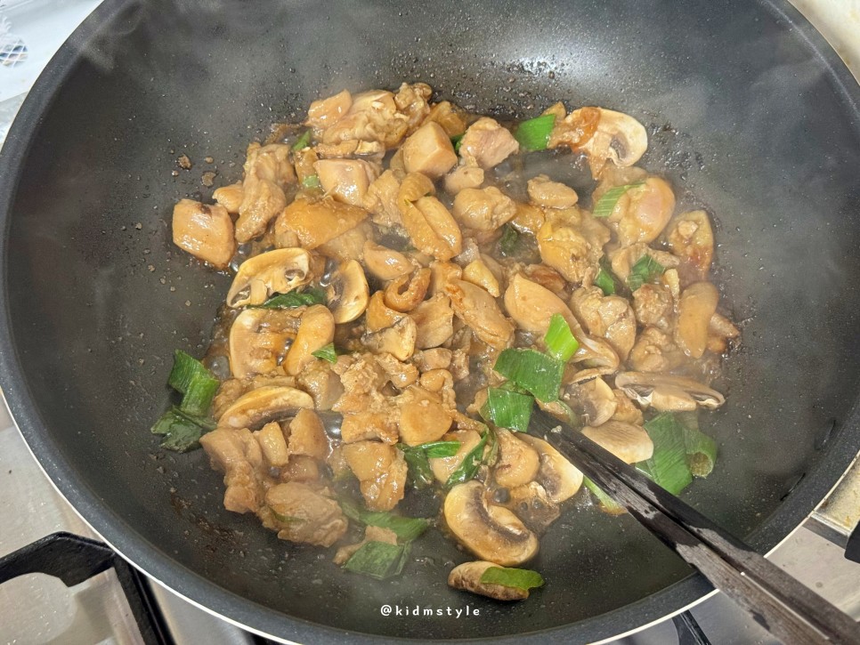 역시 대파와 양송이버섯을 썰어 넣고 같이 볶아준다. 요리하면서 냄새가 주방에 진동한다. 군침이 돈다.