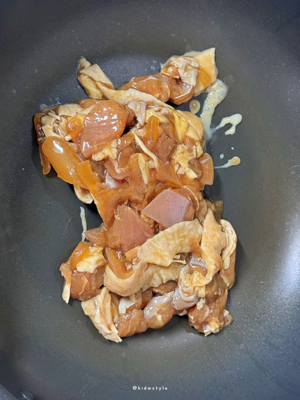 팬에 간장 닭갈비를 붓고 본격적으로 구워본다. 양파, 대파, 당근 등 채소를 추가해서 구워도 괜찮을 것 같다.