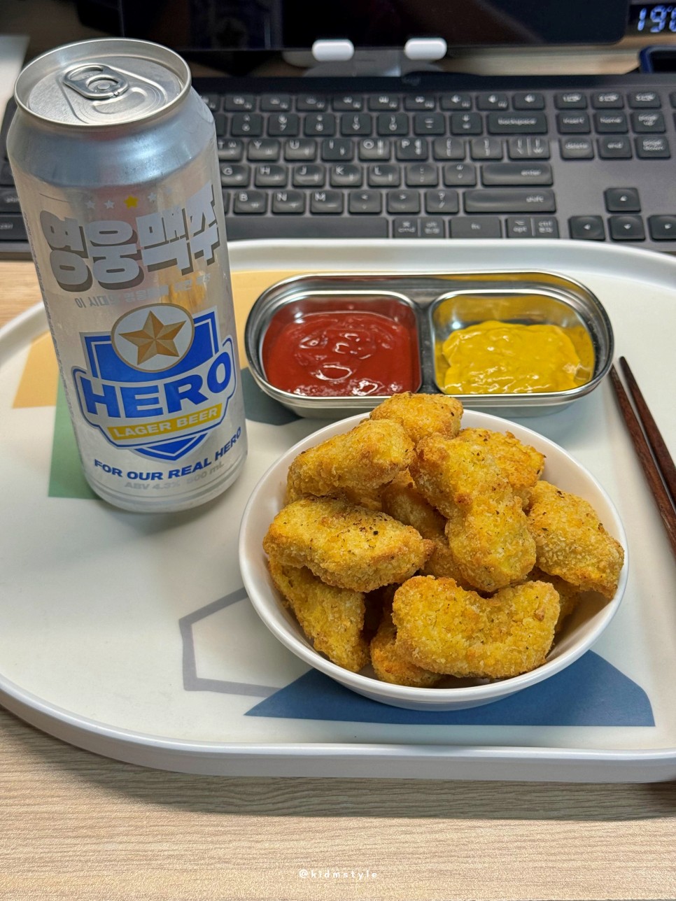 맨입으로 맛보기 아쉬워서 냉동실을 열어보니 몇 개 남지 않은 치킨너겟이 눈에 들어온다. 얼른 에어프라이어에 돌려왔다.