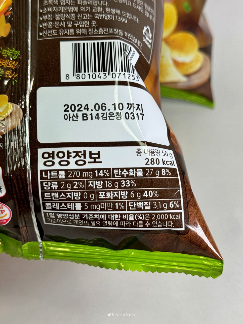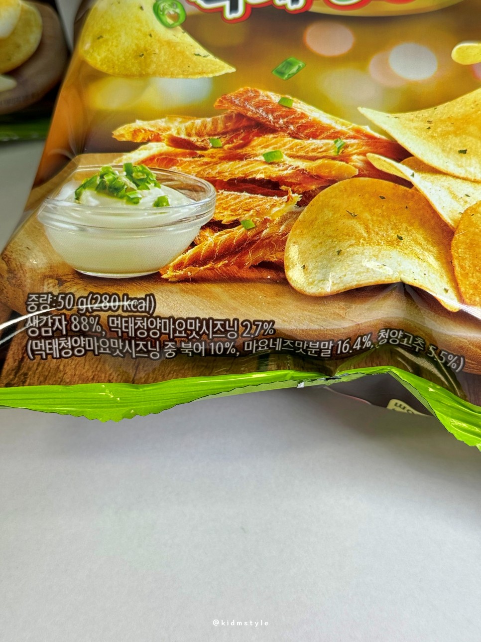 중량은 50g, 280kcal이며 생감자 88%, 먹태청양마요맛 시즈닝 2.7%의 구성이다. 기대가 된다.